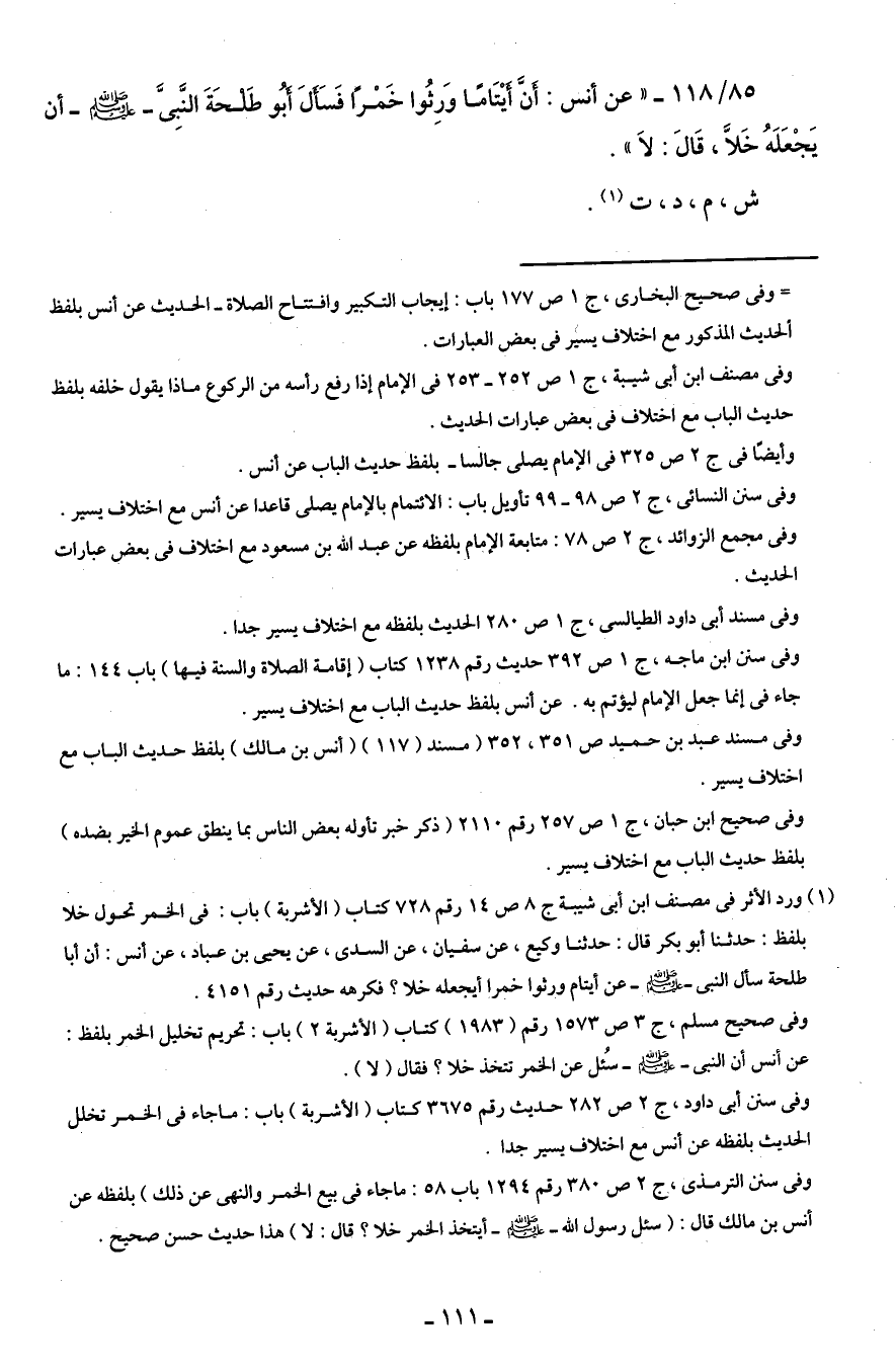 85/ 118 - " عن أنس: أنَّ أيْتَامًا وَرِثُوا خَمْرًا فَسَألَ أبُو طَلحَةَ النبي - صلى الله عليه وسلم - أن يَجْعَلَهُ خَلاَّ، قالَ: لاَ ".