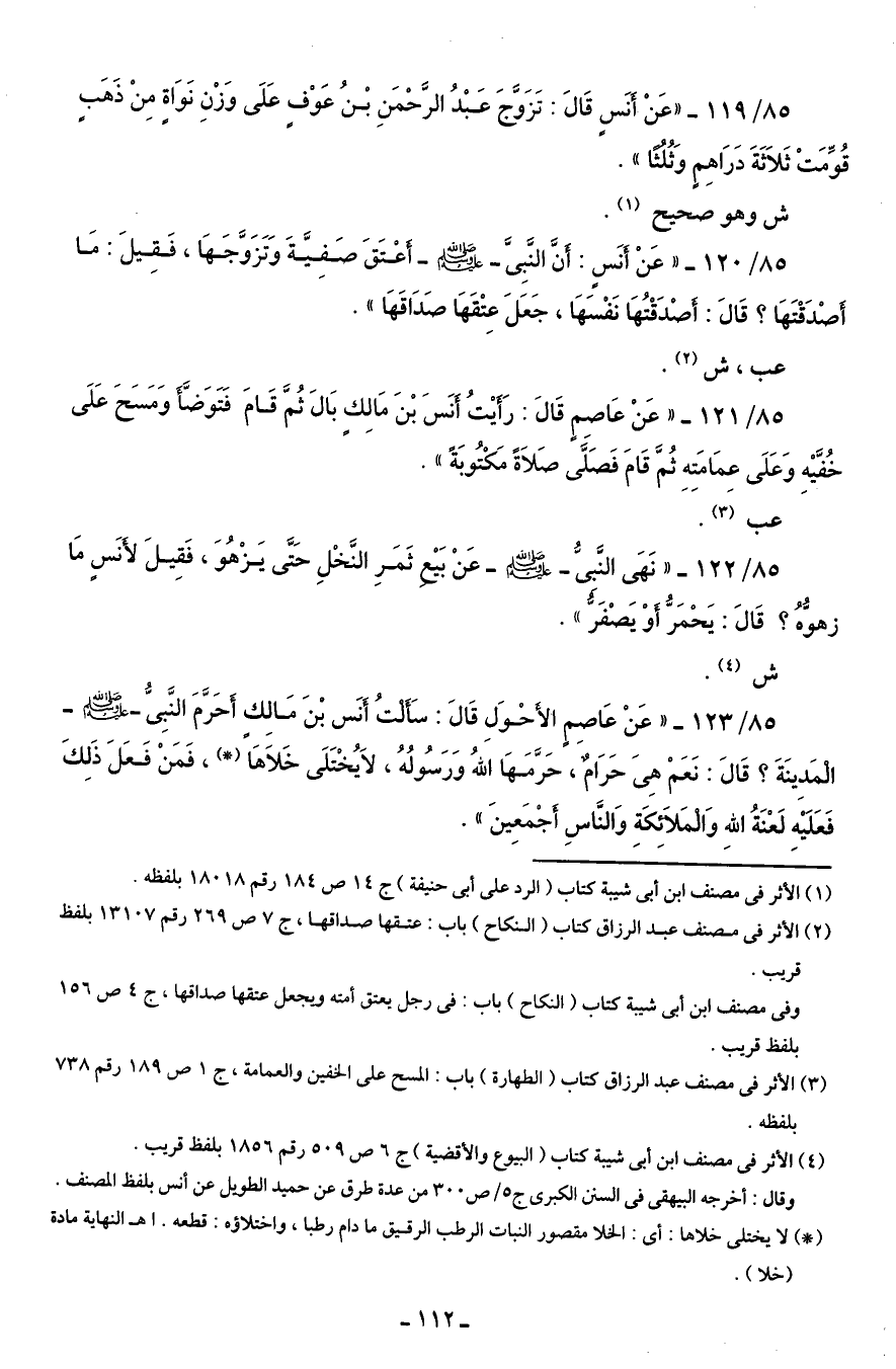 85/ 119 - "عَنْ أنَسٍ قَالَ: تَزَوَّجَ عَبْدُ الرَّحْمَنِ بْنُ عَوْفٍ عَلَى وَزْنِ نَوَاةٍ مِنْ ذَهَبٍ قُوِّمَتْ ثَلاَثَةَ دَرَاهِم وَثُلثًا ".