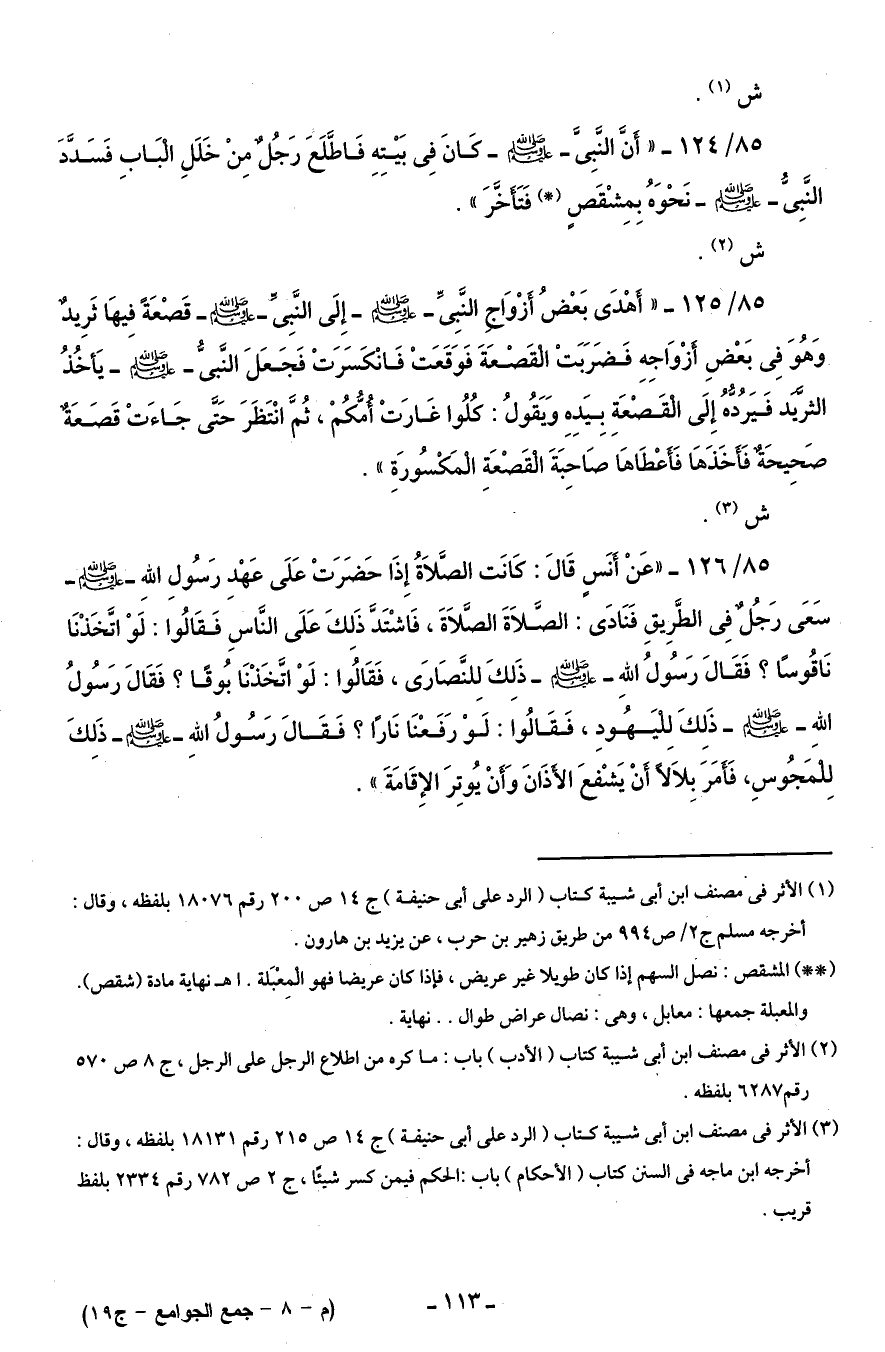 85/ 126 - "عَنْ أنَسٍ قَالَ: كانَت الصَّلاَةُ إِذَا حَضَرَتْ عَلَى عَهْدِ رَسُولِ اللهِ - صلى الله عليه وسلم - سَعَى رَجُلٌ فِى الطَّرِيقِ فَنَادَى: الصَّلاَةَ الصَّلاَةَ، فَاشْتَدَّ ذَلِكَ عَلَى النَّاسِ فَقَالُوا: لَوْ اتَّخَذْنَا نَاقُوسًا؟ فَقَالَ رَسُولُ الله - صلى الله عليه وسلم - ذَلِكَ لِلنَّصَارَى، فَقَالُوا: لَوْ اتَّخَذْنَا بُوقًا؟ فَقَالَ رَسُولُ الله - صلى الله عليه وسلم - ذَلِكَ لليَهُودِ، فَقَالُوا: لَوْ رَفَعْنَا نَارًا؟ فَقَالَ رَسُولُ اللهِ - صلى الله عليه وسلم - ذَلِكَ لِلمجُوسِ، فَأمرَ بِلاَلًا أنْ يَشفعَ الأذَانَ وَأنْ يُوتِرَ الإِقَامَةَ".