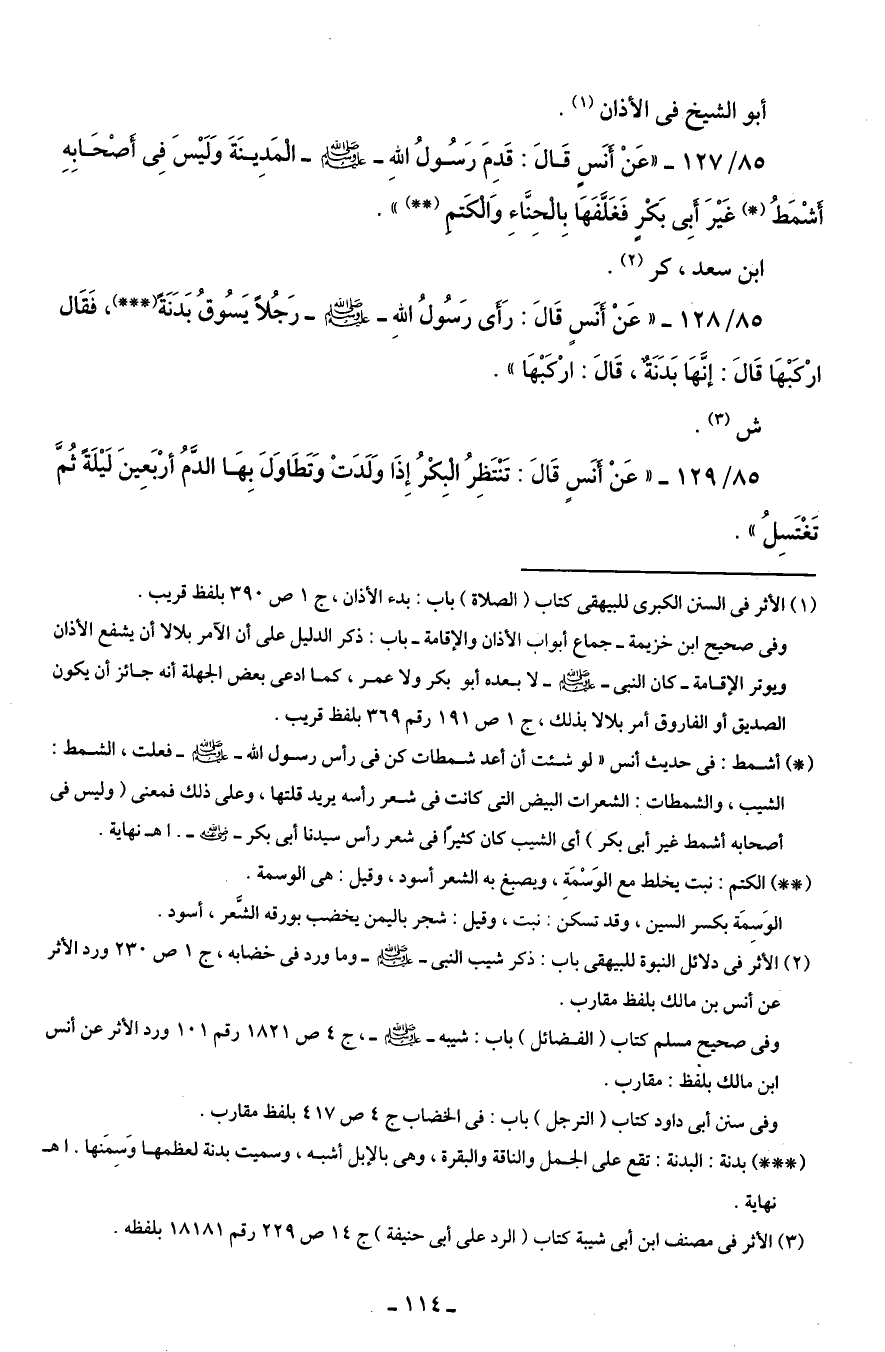 85/ 127 - "عَنْ أنَسٍ قَالَ: قَدِمَ رَسُولُ اللهِ - صلى الله عليه وسلم - المَدِينَةَ وَلَيْسَ فِى أصْحَابِهِ أشْمَطُ (*) غَيْرَ أبِى بَكْرٍ فَغَلَّفَهَا بِالحِنَّاءِ وَالكَتم (* *) ".