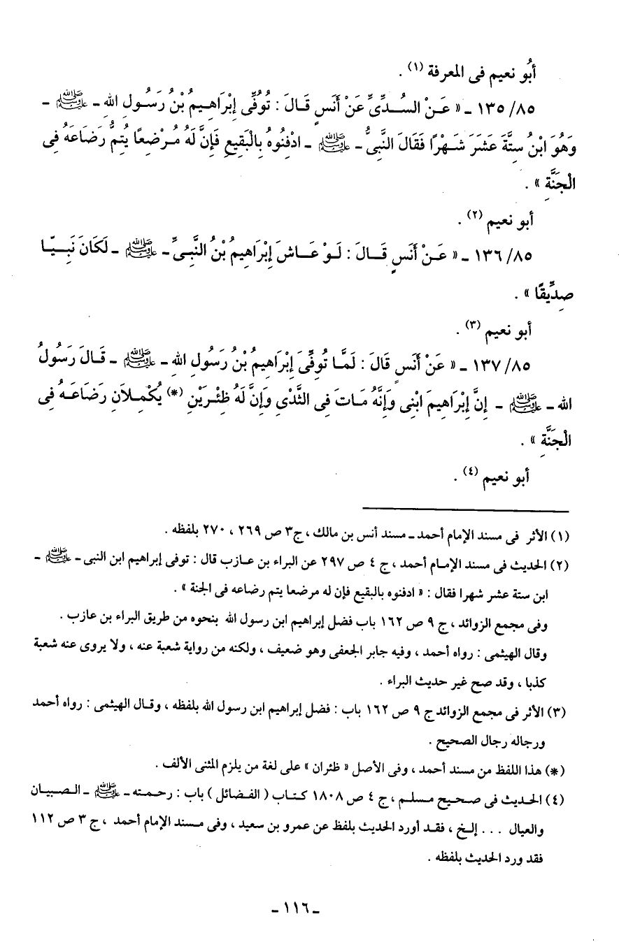85/ 137 - " عَنْ أنَسٍ قَالَ: لَمَّا تُوِفِّىَ إِبْرَاهِيمُ بْنُ رَسُولِ اللهِ - صلى الله عليه وسلم - قَالَ رَسُولُ الله - صلى الله عليه وسلم - إِنَّ إِبْرَاهِيمَ ابْنِى وَإِنَّهُ مَاتَ فِى الثَّدْي وَإنَّ لَهُ ظِئْرَيْنِ (*) يُكْمِلاَنِ رَضَاعَهُ فِى الجَنَّةِ".