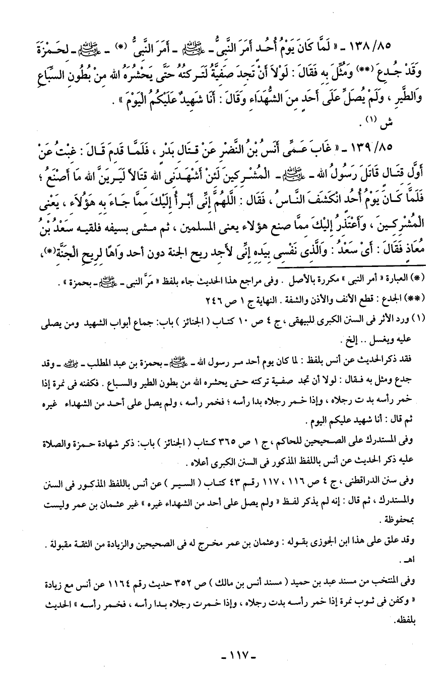 85/ 138 - "لَمَّا كَانَ يَوْمُ أُحُدٍ أمر النَّبِي - صلى الله عليه وسلم - أمَرَ النَّبِىُّ (*) لِحَمْزَةَ وَقَدْ جُدِعَ (* *) وَمُثِّلَ بِه فَقَالَ: لَوْلاَ أن تَجِدَ صَفِيَّةُ لَتَركتُهُ حَتَّى يَحْشُرَهُ الله مِنْ بُطُونِ السِّبَاع وَالطَّيرِ، وَلَمْ يُصَلِّ عَلَىَ أحَدٍ مِنَ الشُّهَدَاءِ وَقَالَ: أنَا شَهِيدٌ عَلَيْكُمُ اليَوْمَ".