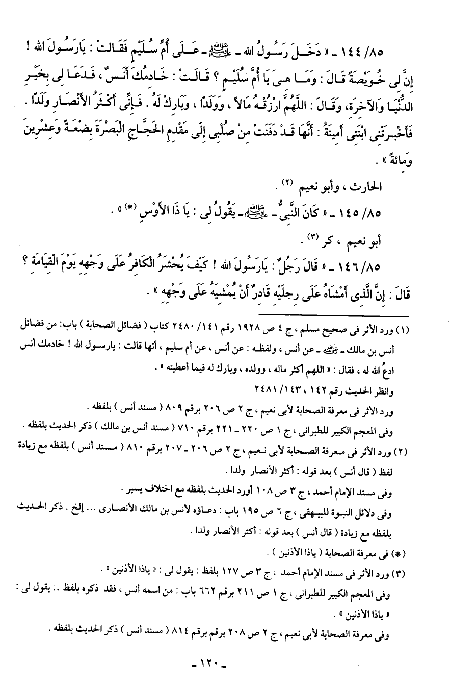 85/ 144 - "دَخَلَ رَسُولُ الله - صلى الله عليه وسلم - عَلَى أُمّ سُلَيْمٍ فَقَالتْ: يَارَسُولَ الله! إِنَّ لِى خُوَيْصَةً قَالَ: وَمَا هىَ يَا أُمَ سُلَيْمٍ؟ قَالَتْ: خَادِمُكَ أنَسٌ، فَدَعَا لِى بِخَيْرِ الدُّنْيَا وَالآخِرَةِ، وَقَالَ: اللَّهُمَّ ارْزُقْهُ مَالًا، وَوَلَدًا، وَبَارِكْ لَهُ. فَإِنِّى أكْثَرُ الأنْصَارِ وَلَدًا. فَأخْبرَتْنِى ابْنَتِى أمِينَةُ: أنَّهَا قَدْ دَفَنَتْ مِنْ صُلبِى إِلَى مَقْدِم الحَجَّاج البَصْرَةَ بِضْعَةً وَعِشْرِينَ وَمِائةً ".
