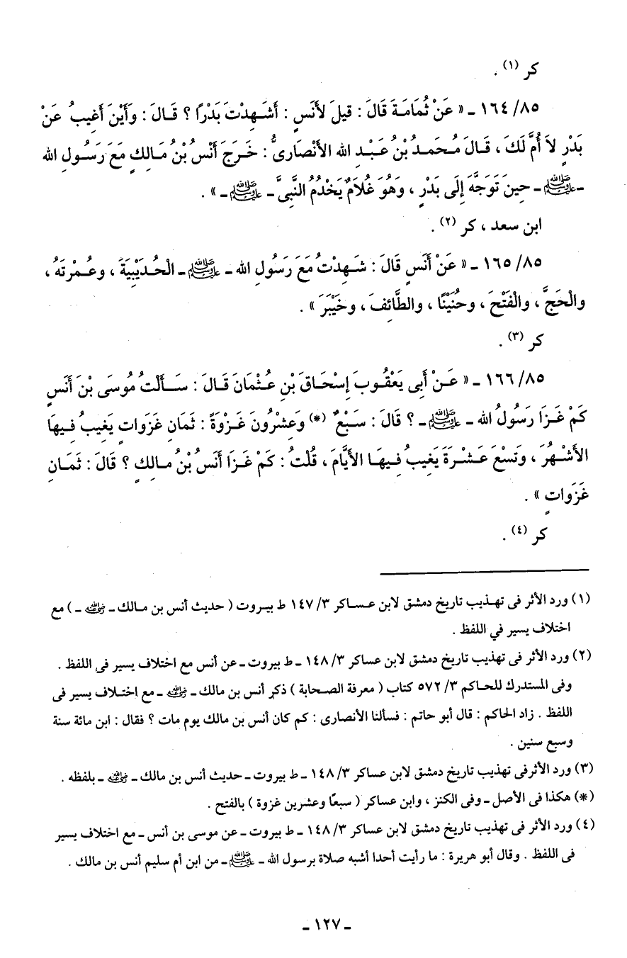 85/ 165 - " عَنْ أنَسٍ قَالَ: شَهِدْتُ مَعَ رَسُولِ الله - صلى الله عليه وسلم - الحُدَيْبِيَةَ، وعُمْرتَهُ، والحجَّ، والفَتْحَ، وحُنَيْنًا، والطَّائِفَ، وخَيْبَرَ".