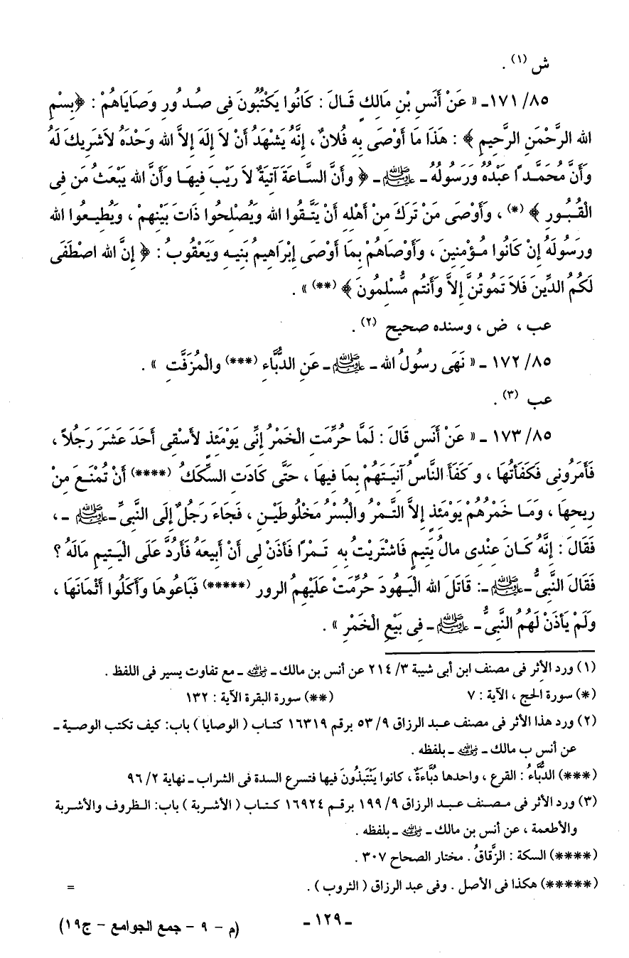 85/ 173 - "عَنْ أنَسٍ قَالَ: لَمَّا حُرِّمَتِ الخَمْرُ إِنِّى يَوْمَئذ لأسْقِى أَحَدَ عَشَرَ رَجُلًا، فَأَمرُونِى فَكَفَأتُهَا، وَكفَأَ النَّاسُ آنِيَتَهُمْ بِمَا فِيهَا، حَتَّى كادَتِ السِّكِّكُ (* * * *) أنْ تُمْنَعَ مِنْ رِيحِهَا، وَمَا خَمْرُهُمْ يَوْمَئِذٍ إِلَّا التَّمْرُ والْبُسْرُ مَخْلُوطَيْنِ، فَجَاءَ رَجُلٌ إِلَى النبِىِّ - صلى الله عليه وسلم -، فَقَالَ: إِنَّهُ كانَ عِنْدِى مالُ يَتِيمٍ فَاشْتَريْتُ بِهِ تَمْرًا فَأذَنْ لِى أنْ أَبِيعَهُ فَأَرُدَّ عَلَى اليَتِيم مَالَهُ؟ فَقَالَ النَّبِىُّ - صلى الله عليه وسلم -: قَاتَلَ الله اليَهُودَ حُرمَتْ عَلَيْهِمُ الرور (* * * * *) فَبَاعُوهَا وَأَكلُوا أَثمَانَهَا، وَلَمْ يَأذَنْ لَهُمُ النبِىُّ - صلى الله عليه وسلم - فِى بَيعْ الخَمْرِ".