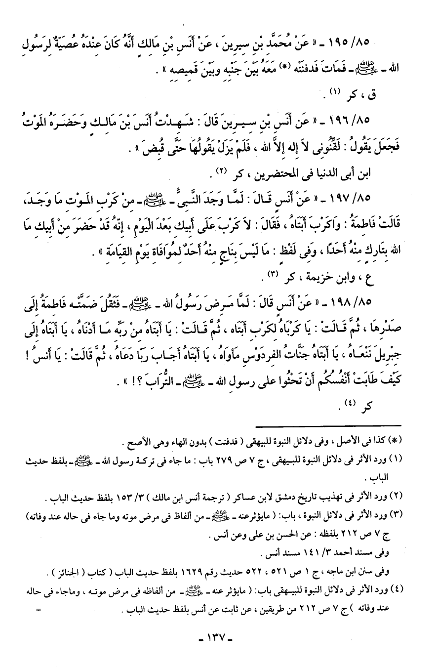 85/ 197 - " عَنْ أنَسٍ قَالَ: لَمَّا وَجَدَ النَّبِىُّ - صلى الله عليه وسلم - مِنْ كَرْبِ المَوْتِ مَا وَجَدَ، قَالَتْ فَاطِمَةُ: وَا كَرْبَ أَبَتَاهُ، فَقَالَ: لاَ كَرْبَ عَلَى أبِيكِ بَعْدَ اليَوْمِ، إِنّهُ قَدْ حَضَرَ مِنْ أبِيكِ مَا الله بِتَارِكٍ مِنْهُ أَحَدًا، وَفِى لَفْظٍ: مَا لَيسَ بِنَاجٍ مِنْهُ أحَدٌ لِمُوَافَاةِ يَوْمِ القِيَامَةِ ".