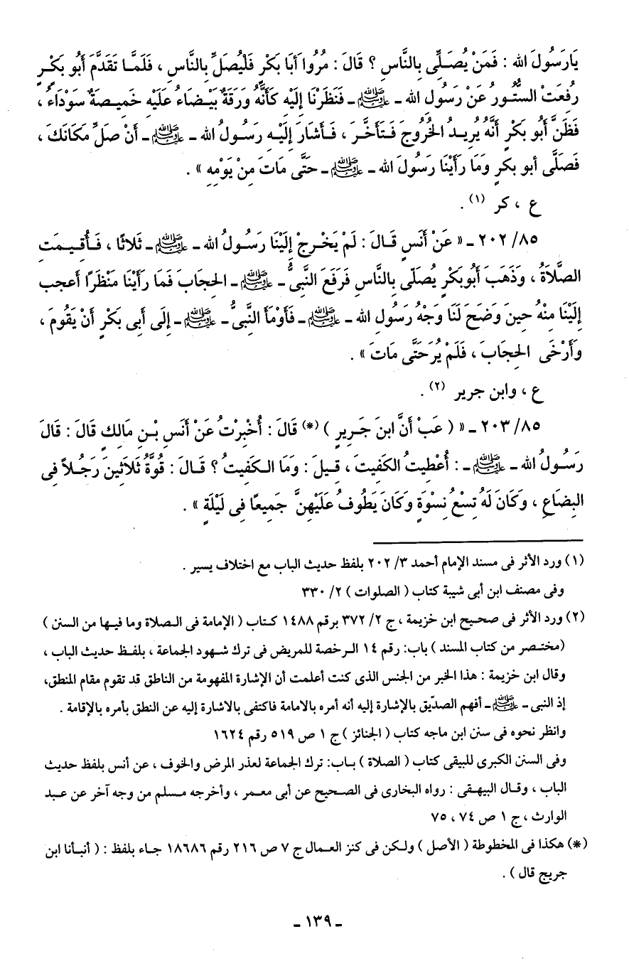 85/ 202 - " عَنْ أنَسٍ قَالَ: لَم يَخْرجْ إِلَيْنَا رَسُولُ الله - صلى الله عليه وسلم - ثَلاثًا، فَأُقيمَتِ الصَّلاَةُ، وَذَهَبَ أبُو بَكْرٍ يُصَلّى بِالنَّاسِ فَرَفَعَ النَّبِىُّ - صلى الله عليه وسلم - الحِجَابَ فَمَا رَأيْنَا مَنْظَرًا أعجب إِلَيْنَا مِنْهُ حِينَ وَضَحَ لَنَا وَجْهُ رَسُولِ الله - صلى الله عليه وسلم - فأوْمَأ النَّبىُّ - صلى الله عليه وسلم - إِلَى أبِى بَكْرٍ أنْ يَقُومَ، وَأرْخَى الحِجَابَ، فَلَمْ يُرَ حَتَّى مَاتَ ".