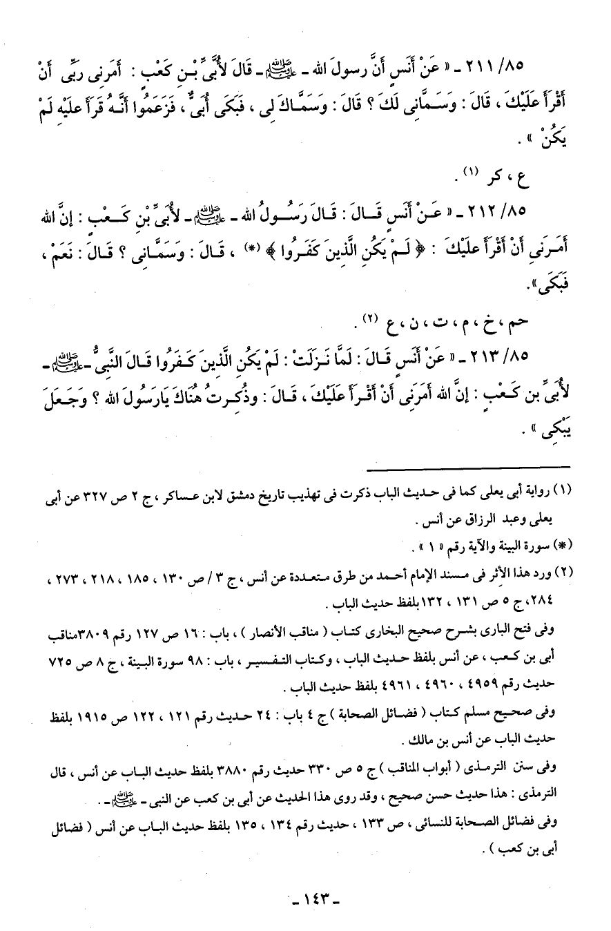 85/ 211 - " عَنْ أَنَسٍ أنَّ رسولَ الله - صلى الله عليه وسلم - قَالَ لأُبَىِّ بْنِ كَعْبٍ: أمَرنِى رَبِّى أنْ أقْرَأ عَلَيْكَ، قَالَ: وَسَمَّانِى لَكَ؟ قَالَ: وَسَمَّاكَ لِى، فَبَكَى أُبَىٌّ، فَزَعَمُوا أنَّهُ قَرَأَ علَيْه لَمْ يَكُنْ ".