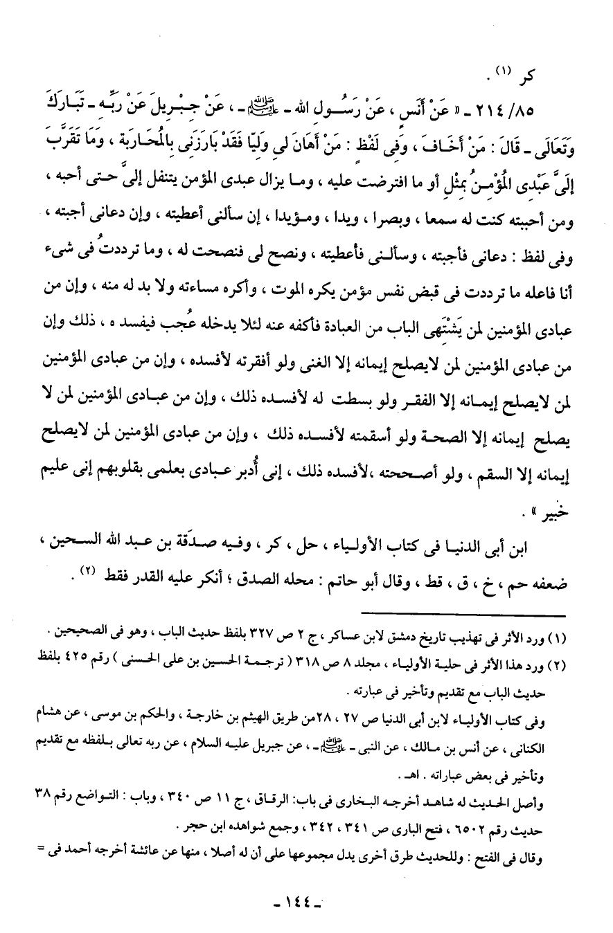85/ 214 - " عَنْ أنَسٍ، عَنْ رَسُولِ الله - صلى الله عليه وسلم -، عَنْ جِبْرِيلَ عَنْ ربِّهِ - تَبَارَكَ وَتَعَالَى - قَالَ: مَنْ أخَافَ، وَفِى لَفْظٍ: مَنْ أَهَانَ لي وَلِيّا فَقَدْ بَارَزَنِى بِالمُحَارَبة، وَمَا تَقَرَّبَ إلَىَّ عَبْدِى المُؤْمِنُ بمِثْلِ أو ما افترضت عليه، وما يزال عبدى المؤمن يتنفل إلىَّ حتى أحبه، ومن أحببته كنت له سمعا، وبصرا، ويدا، ومؤيدا، إن سألنى أعطيته، وإن دعانى أجبته، وفى لفظ: دعانى فأجبته، وسألنى فأعطيته، ونصح لى فنصحت له، وما ترددتُ في شئ أنا فاعله ما ترددت في قبض نفس مؤمن يكره الموت، وأكره مساءته ولا بد له منه، وإن من عبادى المؤمنين لمن يَشْتَهى الباب من العبادة فأكفه عنه لئلا يدخله عُجب فيفسده، ذلك وإن من عبادى المؤمنين لمن لا يصلح إيمانه إلا الغنى ولو أفقرته لأفسده، وإن من عبادى المؤمنين لمن لا يصلح إيمانه إلا الفقر ولو بسطت له لأفسده ذلك، وإن من عبادى المؤمنين لمن لا يصلح إيمانه إلا الصحة ولو أسقمته لأفسده ذلك، وإن من عبادى المؤمنين لمن لا يصلح إيمانه إلا السقم، ولو أصححته، لأفسده ذلك، إنى أُدبر عبادى بعلمى بقلوبهم إنى عليم خبير ".