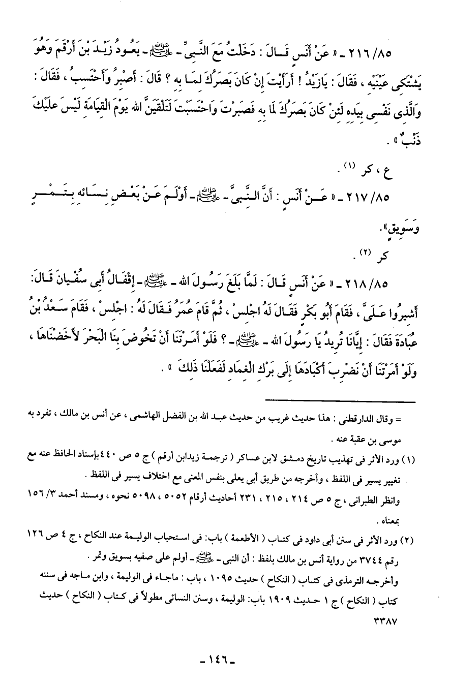 85/ 217 - " عَنْ أنَسٍ: أَنَّ النَّبىَّ - صلى الله عليه وسلم - أوْلَمَ عَنْ بَعْضِ نِسَائهِ بِتَمْرٍ وَسَوِيقٍ ".