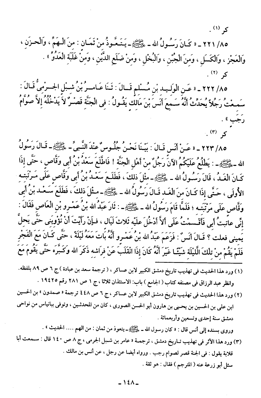 85/ 223 - " عَنْ أنَسٍ قَالَ: بَيْنَا نَحْنُ جُلُوسٌ عِنْدَ النَّبىِّ - صلى الله عليه وسلم - قالَ رَسُولُ الله - صلى الله عليه وسلم -: يَطلُعُ عَلَيْكُمُ الآنَ رَجُلٌ مِنْ أهْلِ الجَنَّةِ! فَاطَّلَعَ سَعْدُ بْنُ أبِى وَقَاصٍ، حَتَّى إِذَا كَانَ الغَدُ، قَالَ رَسُولُ الله - صلى الله عليه وسلم - مِثْلَ ذلِكَ، فَطَلَعَ سَعْدُ بْنُ أبِى وَقَاصٍ عَلَى مَرْتَبتهِ الأولَى، حَتَّى إِذَا كَانَ مِنَ الغَدِ قَالَ رَسُولُ الله - صلى الله عليه وسلم - مِثْلَ ذلِكَ، فَطَلَعَ سَعْد بْنُ أَبِى وَقَاصٍ عَلَى مَرْتَبَتهِ؛ فَلَمَّا قَامَ رَسُولُ الله - صلى الله عليه وسلم -: ثَارَ عَبْدُ الله بْنُ عَمْرِو بْنِ العَاصِ فَقَالَ: إِنِّى عاتبتُ أبِى فَأقْسمْتُ عَلَى ألاَّ أدْخُلَ علَيْهِ ثَلاثَ لَيَالٍ، فإنْ رَأيْتَ أنْ تُؤْوِيَنِى حَتَّى يَحِلَّ يَمِينى فعلت؟ قَالَ أنَسٌ: فَزَعَمَ عَبْدُ الله بْنُ عَمْرٍو أنَّهُ بَاتَ مَعَهُ لَيْلَةً، حَتَّى كَانَ مَعَ الفَجْرِ فَلَمْ يَقُمْ مِنْ تِلكَ الَّليْلَةِ شَيْئًا غَيْرَ أنَّهُ كَانَ إِذَا انْقَلَبَ عَنْ فِرَاشِهِ ذَكَرَ الله وَكبَّرَه حَتَّى يَقُومَ مَعَ