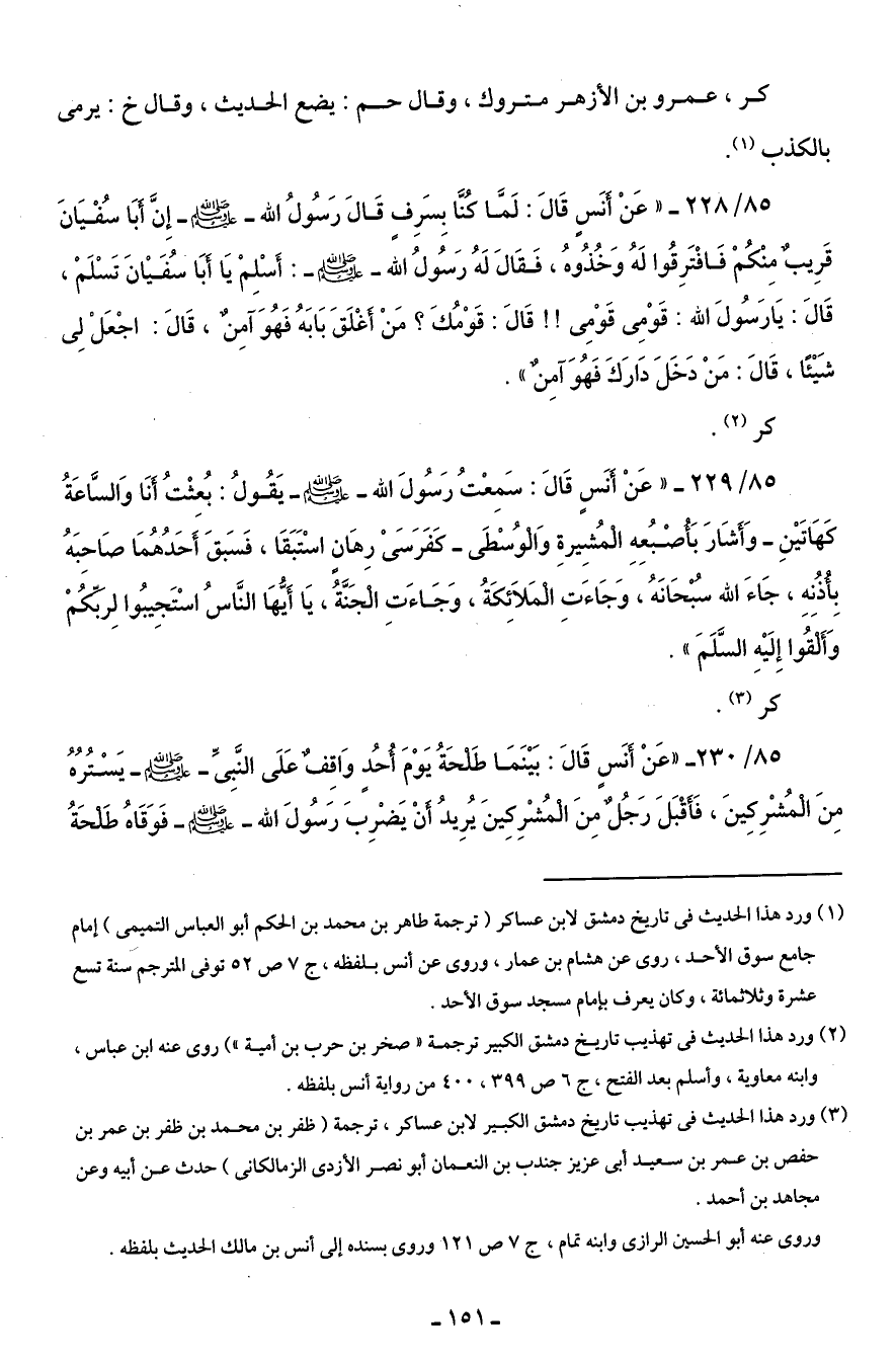 (¬1) ورد هذا الحديث في تاريخ دمشق لابن عساكر (ترجمة طاهر بن محمد بن الحكم أبو العباس التميمى) إمام جامع سوق الأحد، روى عن هشام بن عمار، وروى عن أنس بلفظه، ج 7 ص 52 توفى المترجم سنة تسع عشرة وثلاثمائة، وكان يعرف بإمام مسجد سوق الأحد.