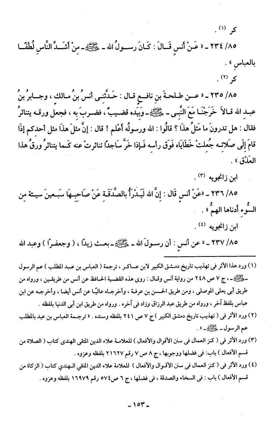 85/ 234 - " عَنْ أنسٍ قَالَ: كَانَ رسولُ الله - صلى الله عليه وسلم - مِن أشَدِّ النَّاسِ لُطفًا بالعباسِ ".