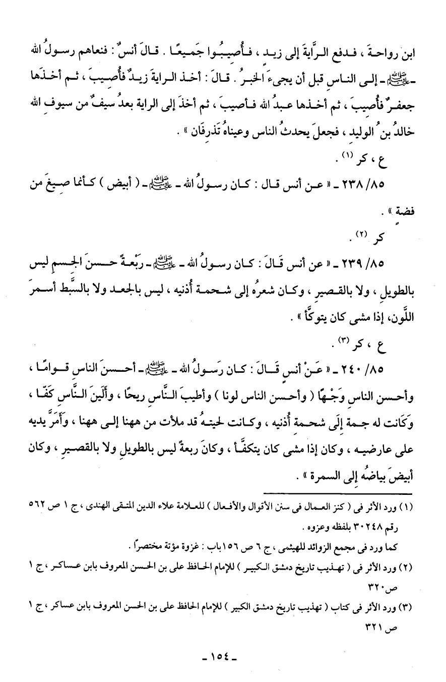 85/ 240 - " عَنْ أنسٍ قَالَ: كان رَسولُ الله - صلى الله عليه وسلم - أحسنَ الناسِ قوامًا، وأحسن الناسِ وَجْهًا (وأحسن الناس لونا) وأطيبَ النَّاسِ ريحًا، وأَلينَ النَّاسِ كَفّا، وَكَانت له جمة إِلَى شحمةِ أُذنيه، وكانت لحيتهُ قد ملأت من هاهنا إلى هاهنا، وَأمَرَّ يديه على عارضيه، وكان إذا مشى كان يتكفّأ، وكانَ ربعةً ليس بالطويلِ ولا بالقصيرِ، وكان أبيضَ بياضُه إِلى السمرة ".