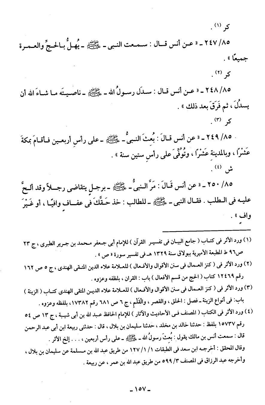 85/ 248 - " عن أنس قال: سدَل رسولُ الله - صلى الله عليه وسلم - ناصيتَه ما شاءَ الله أن يسدُلَ، ثم فَرَقَ بعد ذلك ".