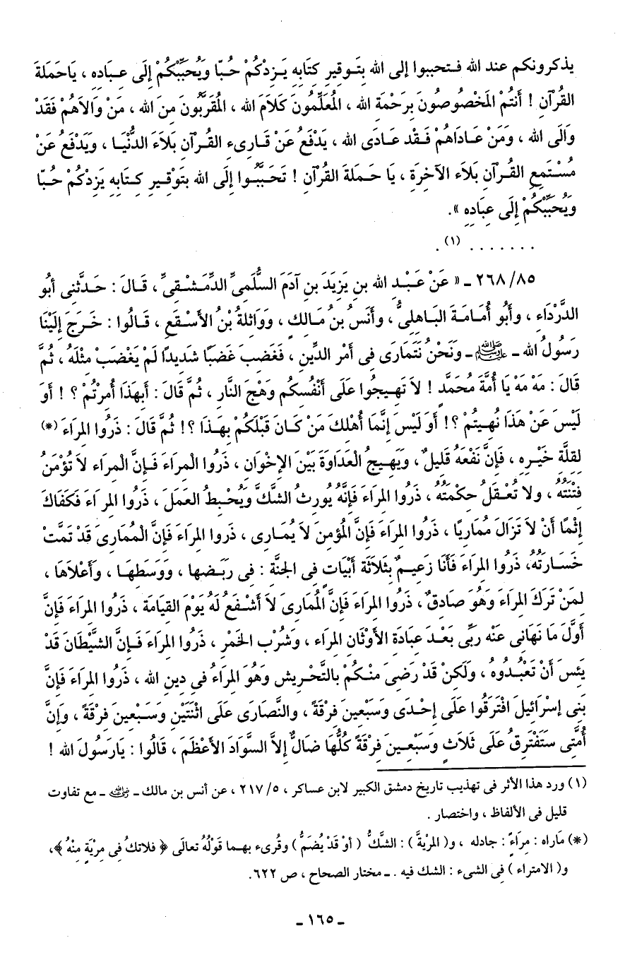 85/ 268 - "عَنْ عَبْدِ الله بنِ يَزِيَدَ بنِ آدَمَ السُّلَمِىِّ الدَّمَشْقِىِّ، قَالَ: حَدَّثنِى أبُو الدَّرْدَاءِ، وأبُو أُمَامَةَ البَاهِلِيُّ، وأنَسُ بنُ مَالِك، وَوَاثِلةُ بْنُ الأسْقَع، قَالُوا: خَرجَ إِلَيْنَا رَسُولُ الله - صلى الله عليه وسلم - وَنَحْنُ نَتَمَارَى فِى أمْر الدَّينِ، فَغَضِبَ غَضبًا شَدِيدًا لَمْ يَغْضَبْ مِثْلَهُ، ثُمَّ قَالَ: مَهْ مَهْ يَا أمَّةَ مُحَمَّد! لاَ تَهِيجُوا عَلَى أنْفُسِكُم وَهْجَ النَّارِ، ثُمَّ قَالَ: أَبِهَذَا أُمِرْتُمْ؟ ! أَوَ لَيْسَ عَنْ هَذَا نُهِيتُمْ؟ ! أَوَ لَيْسَ إِنَّمَا أُهْلكَ مَنْ كانَ قَبْلَكُمْ بِهَذَا؟ ! ثُمَّ قَالَ: ذَرُوا المِرَاءَ (*) لِقِلَّةِ خَيْرِهِ، فَإِن نَفْعَهُ قَلِيلٌ، وَيَهِيجُ الْعَدَاوَةَ بَيْنَ الإِخْوَانِ، ذَرُوا الْمِرَاءَ فَإِنَّ الْمِرَاء لاَ تُؤْمَنُ فِتْنَتُهُ، ولا تُعْقَلُ حِكْمَتُهُ، ذَرُوا المِرَاءَ فَإِنَّهُ يُورِثُ الشَّكَّ وُيحْبِطُ العَمَلَ، ذَرُوا المِراءَ فَكَفَاكَ إِثْمًا أنْ لاَ تَزَالَ مُمَارِيًا، ذَرُوا المِرَاءَ فَإِنَّ المُؤمِنَ لاَ يُمَارِى، ذَروا المِرَاءَ فَإِنَّ الْمُمَارِىَ قَدْ تَمَّتْ خَسَارَتُهُ، ذَرُوا المِرَاءَ فَأنَا زَعِيم بِثَلاَثَة أبْيَات فِى الجنَّة: فِى رَبَضها، وَوَسَطِهَا، وَأعْلاَهَا، لمَنْ تَرَكَ المِرَاءَ وَهُوَ صَادِقٌ، ذَرُوا المِرَاءَ فَإِنَّ المُمَارِىَ لَاَ أَشْفعُ لَهُ يَوْمَ القِيَامَة، ذَرُوا الِمرَاءَ فَإِنَّ أوَّلَ مَا نَهَانِى عَنْه ربِّى بَعْدَ عِبَادَةِ الأوْثَانِ المِرَاء، وَشُرْب الخَمْرِ، ذَرُوا الِمرَاءَ فَإِن الشَّيْطَانَ قَدْ يَئِسَ أنْ تَعْبُدُوهُ، وَلَكِنْ قَدْ رَضِىَ منْكُمْ بالتَّحْرِيش وَهُوَ الِمرَاءُ في دِينِ الله، ذَرُوا المِرَاءَ فَإِنَّ بَنى إسْرَائِيلَ افْتَرَقُوا عَلَى إِحْدَى وَسَبْعِينَ فرْقَةً، والنَّصَارَى عَلَى اثْنَتَيْنِ وَسَبْعِينَ فِرْقَة، وَإنَّ أُمَّتِى سَتَفْتَرِقُ عَلَى ثَلاَثٍ وَسَبْعِينَ فِرْقَةً كلُّهَا ضَالٌّ إِلاَّ السَّوَادَ الأعْظَمَ، قَالُوا: يَارَسُولَ الله!