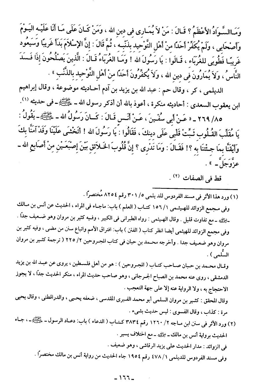 وَمَا السَّوَادُ الأعْظَمُ؟ قَالَ: مَنْ لاَ يُمَارِى فِى دِينِ الله، وَمَنْ كَانَ عَلَى مَا أنَا عَلَيْهِ اليَوْمَ وَأصْحَابِى، وَلَمْ يُكَفِّرْ أحَدًا مِنْ أهْلِ التَّوْحِيدِ بِذَنْبِهِ، ثُمَّ قَالَ: إِنَّ الإسْلاَمَ بَدَأ غَريبًا وَسَيعُود غَرِيبًا فَطُوبَى للغُرَبَاءِ، قَالَوا: يَا رَسُولَ الله! وَمَا الغُرَبَاءُ قَالَ: الَّذِينَ يَصْلُحُونَ إِذَا فَسَدَ النَّاسُ، وَلاَ يُمَارُونَ فِى دِينِ الله، وَلاَ يُكفِّرُونَ أحَدًا مِنْ أهْلِ التَّوْحِيدِ بِالذَّنْبِ".