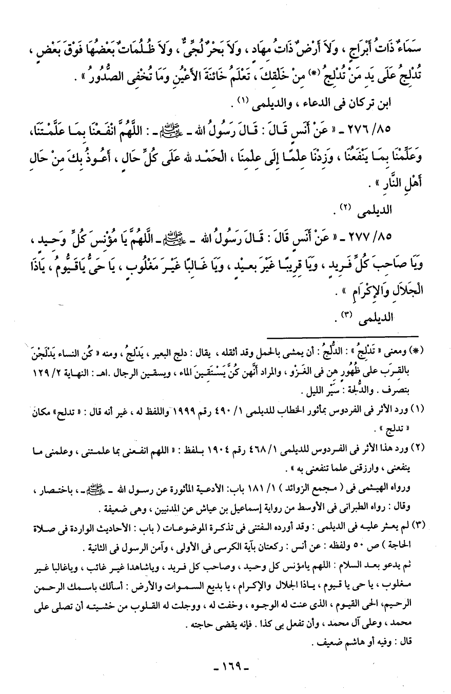 85/ 277 - "عَنْ أنَسٍ قَالَ: قَالَ رَسُولُ الله - صلى الله عليه وسلم - الَّلهُمَّ يَا مُؤْنِسَ كُلِّ وَحِيد، وَيَا صَاحِبَ كُلِّ فَرِيدٍ، وَيَا قِرِيبًا غَيْرَ بعيْدٍ، وَيَا غَالِبًا غَيْرَ مَغْلُوبٍ، يَا حَى يَاقَيُّومُ، يَاذَا الجَلاَلِ وَالإِكْرَامِ".