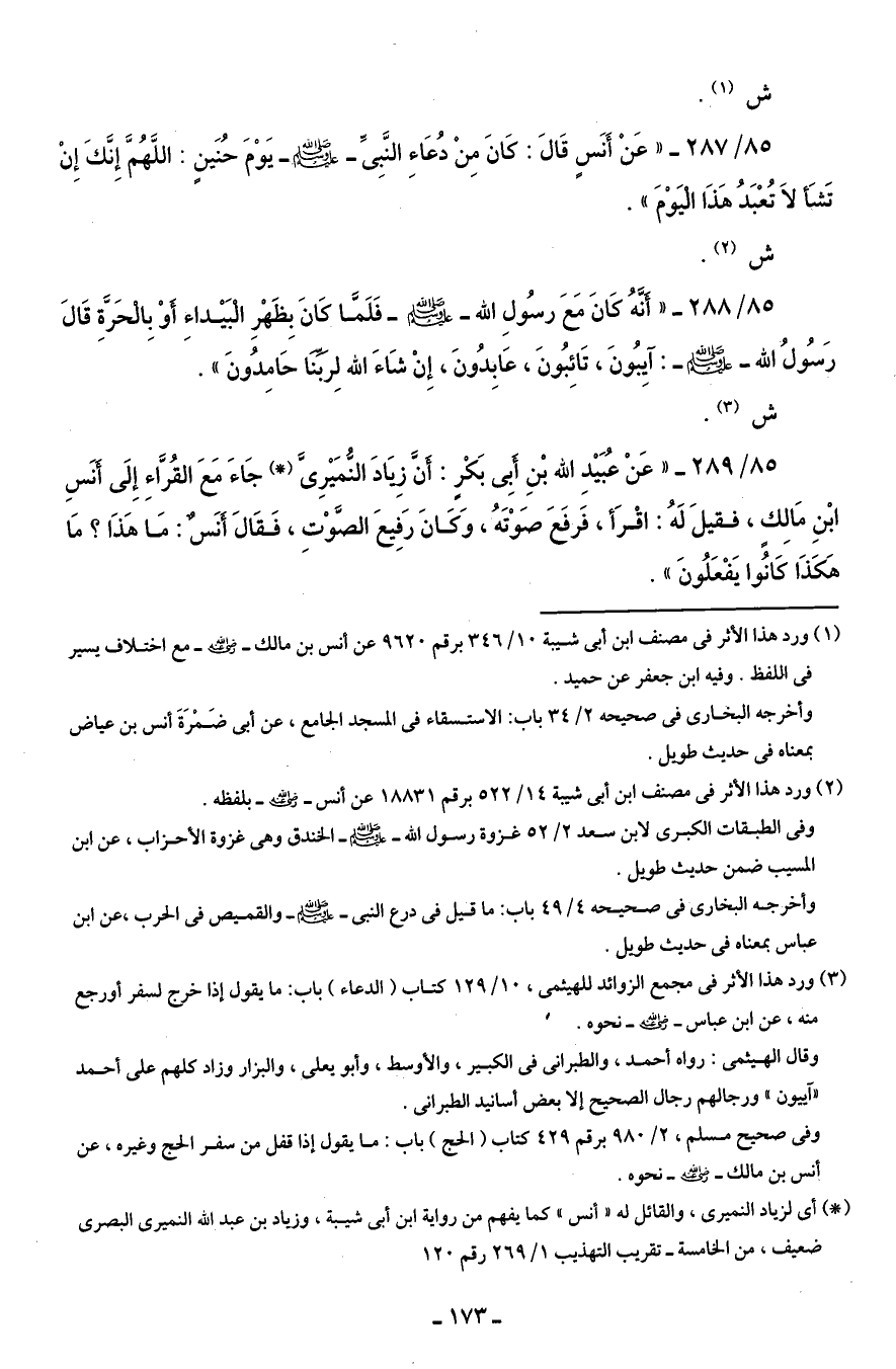 85/ 289 - "عَنْ عُبَيْدِ الله بْنِ أبِى بَكْرٍ: أَنَّ زِيَادَ النُّمَيْرِىَّ (، ) جَاءَ مَعَ القُرَّاءِ إِلَى أنَسِ ابْنِ مَالِكٍ، فقيلَ لَهُ: اقْرَأ، فَرفَعَ صَوْتَهُ، وَكَانَ رَفِيعَ الصَّوْتِ، فَقَالَ أنَسٌ: مَا هَذَا؟ مَا هَكَذَا كَانُوا يَفْعَلُونَ".