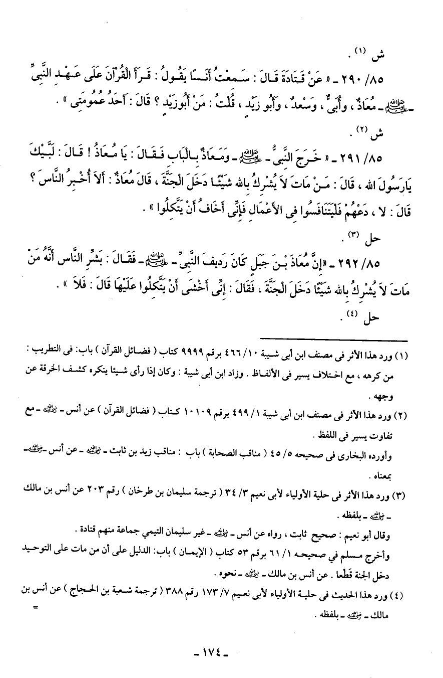 85/ 292 - "إِن مُعَاذَ بْنَ جَبَلٍ كَانَ رَديفَ النَّبِىِّ - صلى الله عليه وسلم - فَقَالَ: بَشِّرِ النَّاس أنَّهُ مَنْ مَاتَ لاَ يُشْرِكُ بِالله شَيْئًا دَخَلَ الجَنَّةَ، فَقَالَ: إِنِّى أَخْشَى أنْ يَتَكِلُوا عَلَيْهَا قَالَ: فَلاَ ".