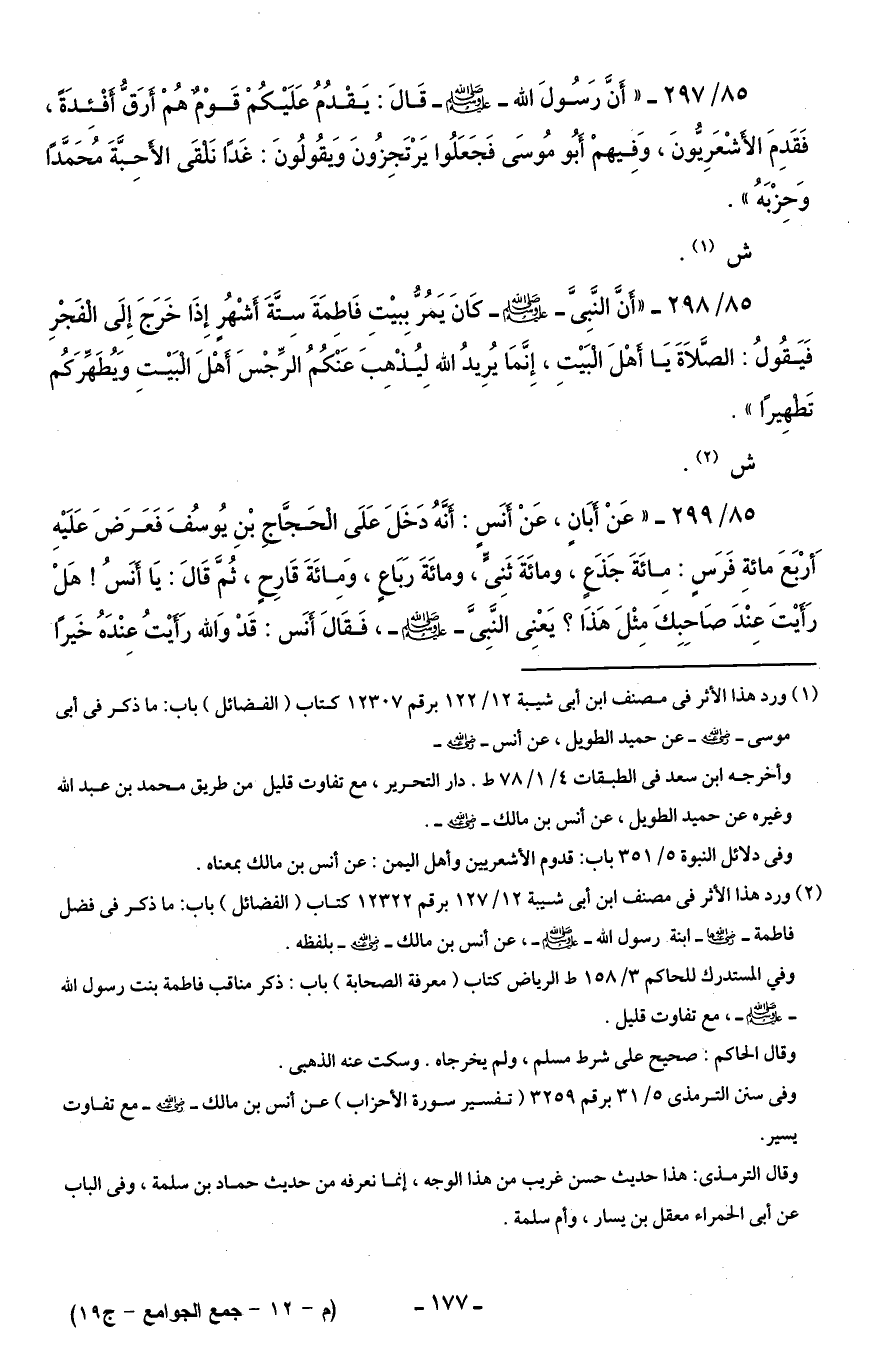 85/ 298 - "أنَّ النَّبِىَّ - صلى الله عليه وسلم - كَانَ يَمُرُّ بِبيْتِ فَاطِمَةَ سِتَّةَ أشْهُرٍ إِذَا خَرجَ إِلَى الْفَجْرِ فَيَقُولُ: الصَّلاَةَ يَا أهْلَ الْبَيْتِ، إِنَّمَا يُرِيدُ الله لِيُذْهِبَ عَنْكُمُ الرِّجْسَ أَهْلَ البَيْت وَيُطَهِّرَكُم تَطهِيرًا".