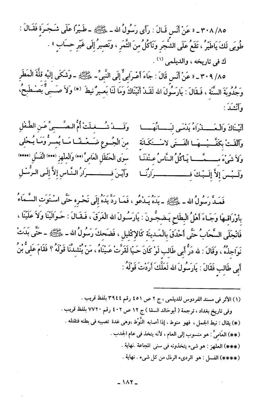 85/ 309 - "عَنْ أَنَسٍ قَالَ: جَاءَ أَعْرَابِيٌّ إِلَى النَّبِىِّ - صلى الله عليه وسلم - وَشَكَى إِليْه قِلَّةَ الْمَطَرِ وَجُدُوبَةَ السّنَةِ، فَقَالَ: يَارَسُولَ الله لَقَدْ أَتَيْنَاكَ وَمَا لَنَا بَعِيرٌ نيطَ (*) وَلاَ صَبِىَّ يَصْطَبِحُ، وَأَنْشَدَ: