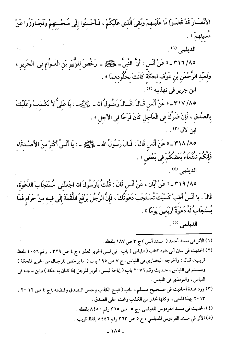 85/ 319 - "عَنْ أبَان، عَنْ أَنَسٍ قَالَ: قُلتُ يَارَسُولَ الله اجْعَلنِى مُسْتَجَابَ الدَّعْوَةِ، قَالَ: يا أنَسُ أطِبْ كَسْبَكَ تُسْتَجَبْ دَعْوَتُكَ، فَإِنَّ الرَّجُلَ يَرْفَعُ اللُّقْمَةَ إِلَى فِيهِ مِنْ حَرَامٍ فَمَا يُسْتجَابُ لَهُ دَعْوَةٌ أرْبَعِينَ يَوْمًا ".