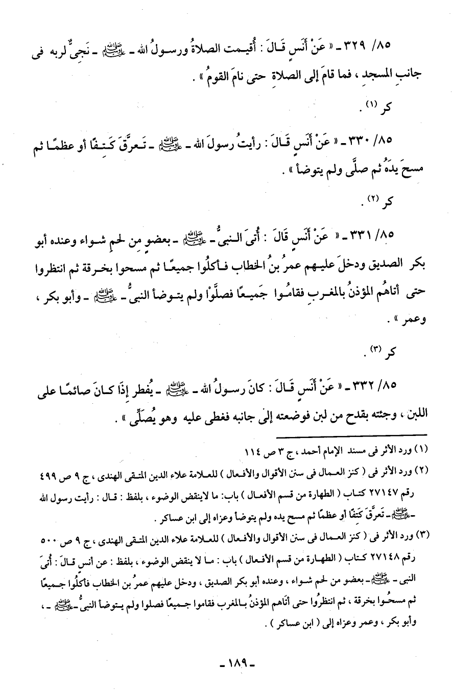 85/ 330 - "عَنْ أَنَسٍ قَالَ: رأيتُ رسولَ الله - صلى الله عليه وسلم - تَعرَّق كتِفًا أو عظمًا ثم مسحَ يدَهُ ثم صلَّى ولم يتوضأ".