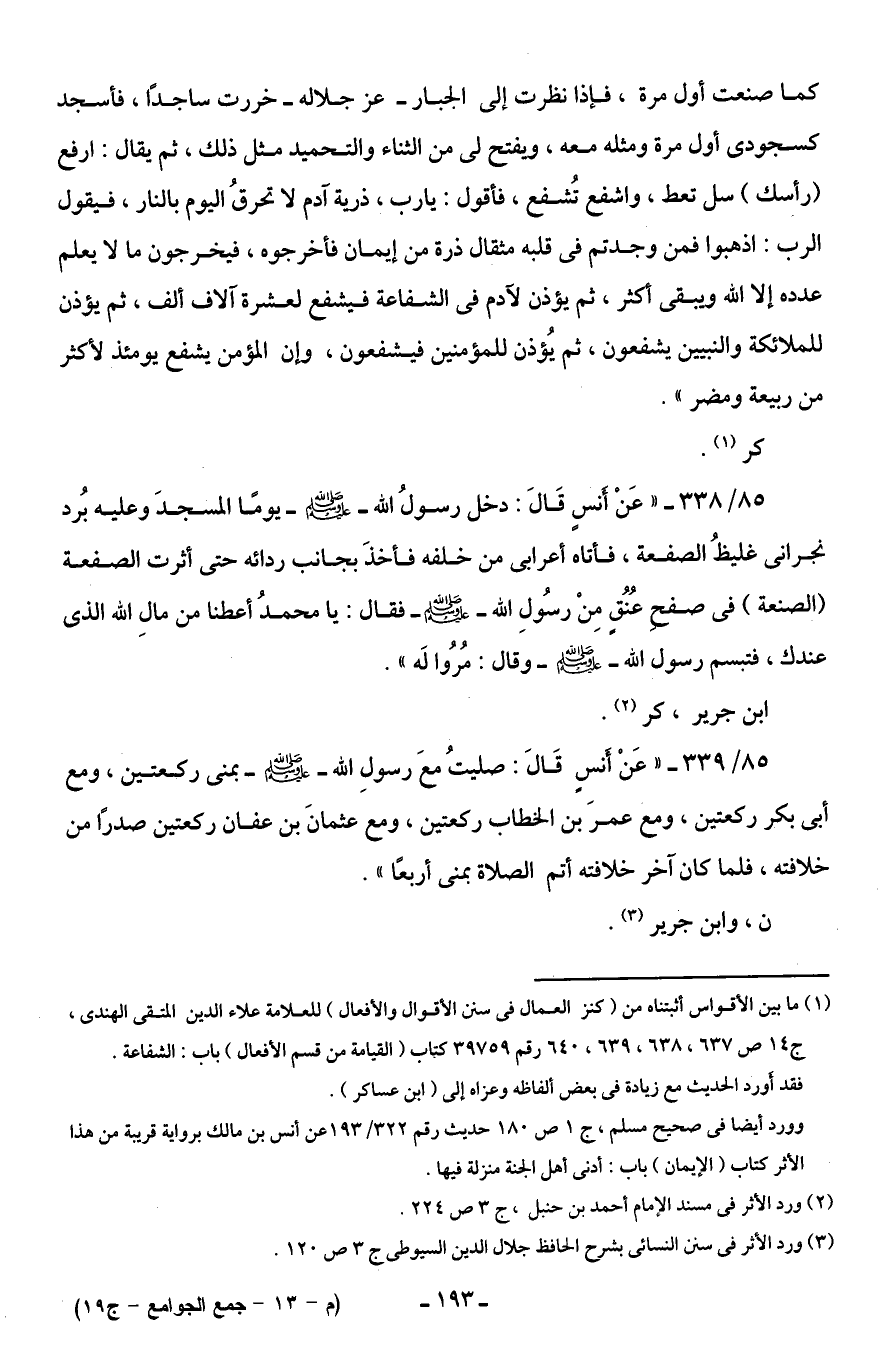 (¬1) ما بين الأقواس أثبتناه من (كنز العمال في سنن الأقوال والأفعال) للعلامة علاء الدين المتقى الهندى، ج 14 ص 637، 638، 639، 640 رقم 39759 كتاب (القيامة من قسم الأفعال) باب: الشفاعة.