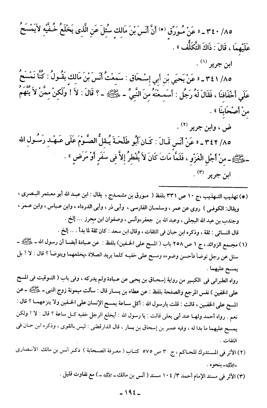 85/ 340 - "عَنْ مُوَرِّقٍ (*) أَنَّ أَنَسَ بْنَ مَالِكٍ سُئِلَ عَنِ الَّذِى يَخْلَعُ خُفَّيْهِ لاَ يَمْسَحُ عَلَيْهِمَا، قَالَ: ذَاكَ التَّكَلُّف".