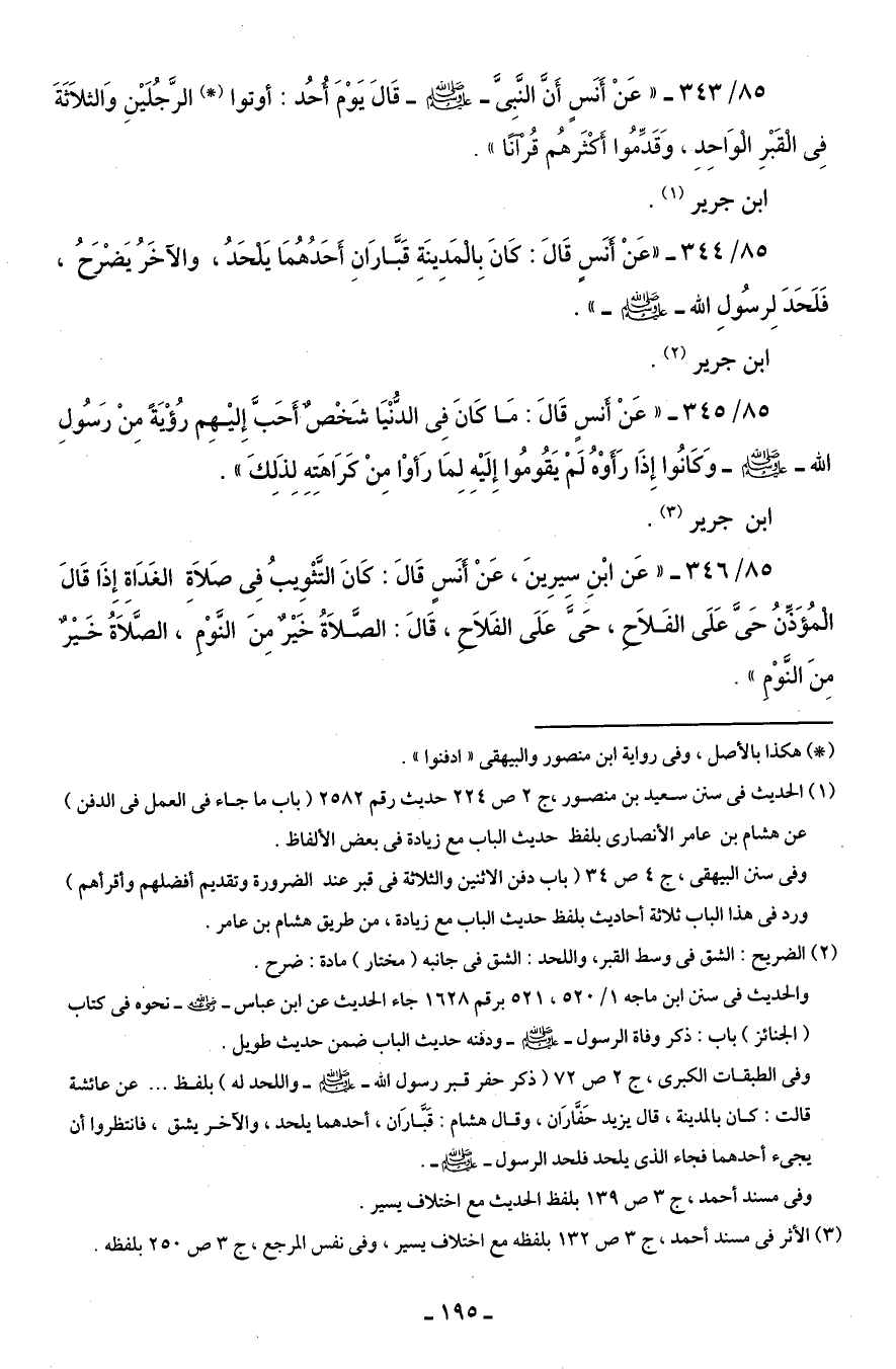 85/ 343 - "عَنْ أَنَسٍ أَنَّ النَّبِىَّ - صلى الله عليه وسلم - قَالَ يَوْمَ أحُد: أوتوا (*) الرَّجُلَيْنِ وَالثلاَثَةَ فِى القَبْرِ الوَاحِدِ، وَقَدِّمُوا أَكْثَرهُم قُرآنًا".