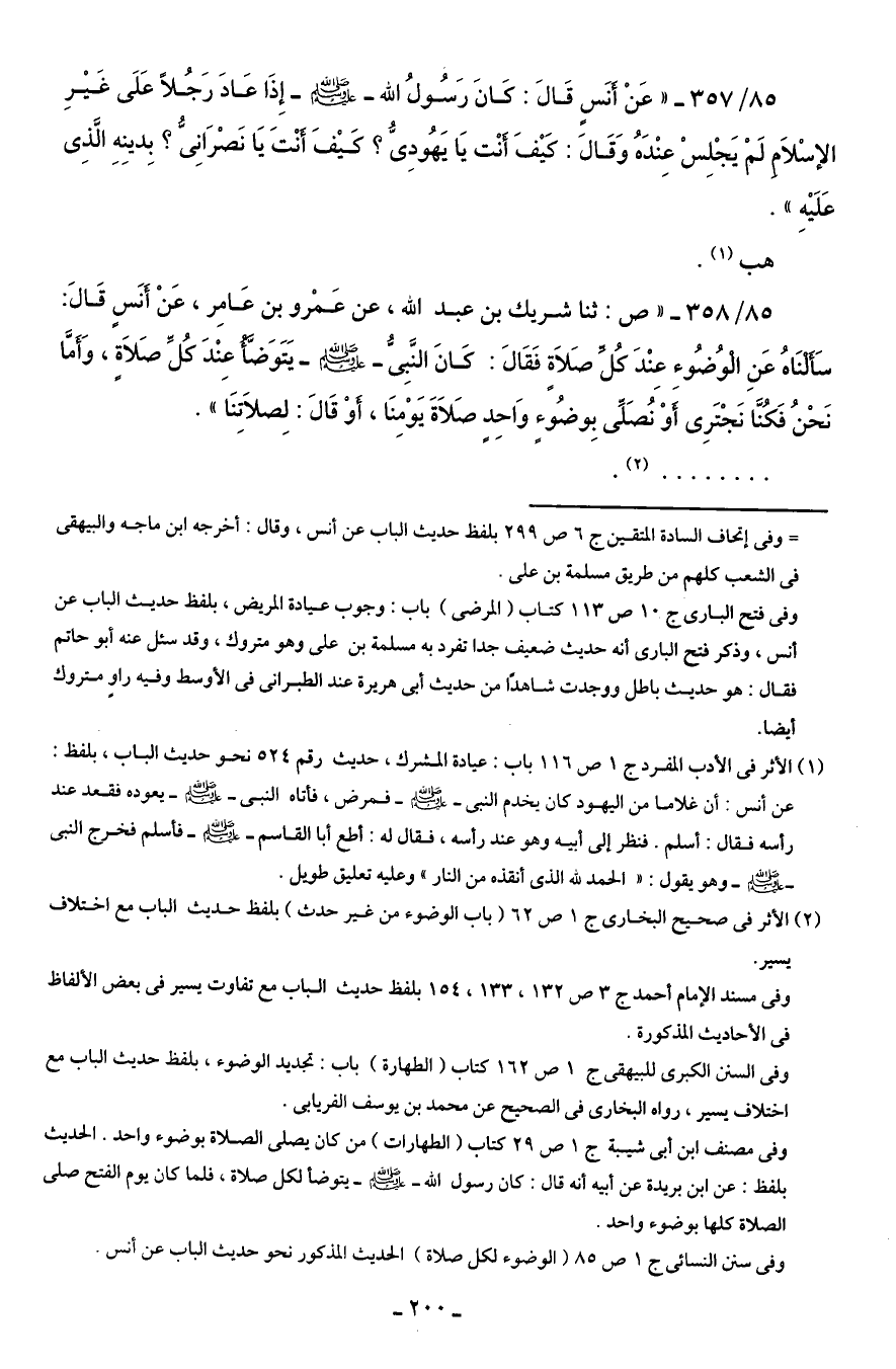 85/ 357 - "عَنْ أنَسٍ قَالَ: كَانَ رَسُولُ الله - صَلَّى الله عليه وسلم - إِذَا عَادَ رَجُلًا عَلَى غَيْرِ الإسْلاَم لَمْ يَجْلِسْ عِنْدَهُ وَقَالَ: كَيْفَ أنْت يَا يَهُودِىُّ؟ كَيْفَ أنْتَ يَا نَصْرَانِى؟ بِدينِهِ الَّذِى عَلَيْهِ".