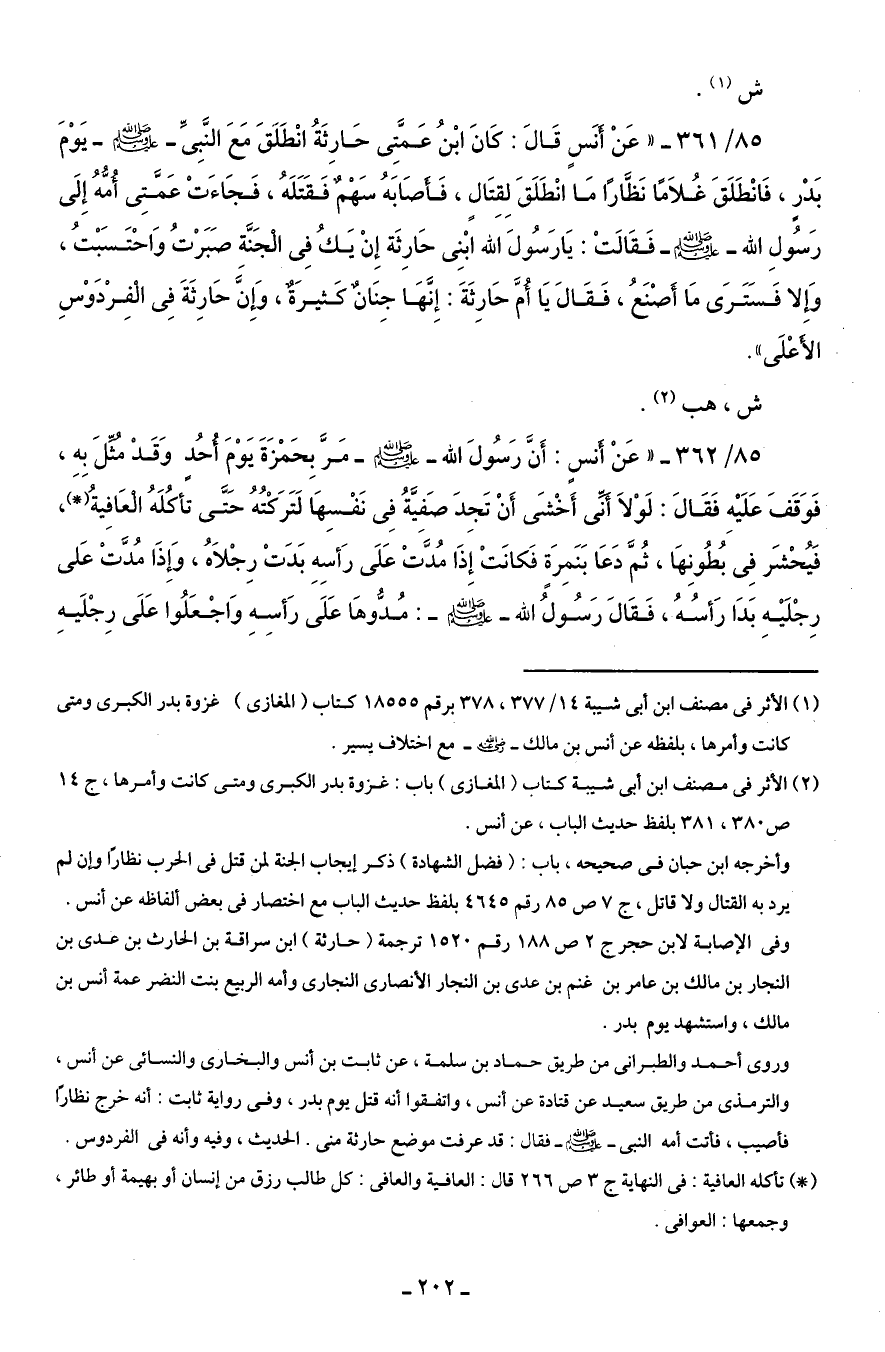 85/ 362 - "عَنْ أنسٍ: أَنَّ رَسُولَ الله - صَلَّى الله عليه وسلم - مَرَّ بِحَمْزَةَ يَوْمَ أحُد وَقَدْ مُثِّلَ بِهِ، فَوَقَفَ عَلَيْهِ فَقَالَ: لَوْلاَ أنِّى أَخْشَى أَنْ تَجِدَ صفيَّةُ فِي نَفْسِهَا لَتَرَكْتُهُ حَتَّى تَأكُلَهُ العَافِيةُ (*)، فَيُحْشَر فِى بُطُونِهَا، ثُمَّ دَعَا بَنَمِرَة فَكانَتْ إِذَا مُدَّت عَلَى رَأسِهِ بَدَتْ رِجْلاَهُ، وَإِذَا مُدَّتْ عَلى رِجْلَيْهِ بَدَا رَأسُهُ، فَقَالَ رَسُولُ الله - صلى الله عليه وسلم -: مُدُّوهَا عَلَى رَأسِهِ وَاجْعَلُوا عَلَى رِجْلَيهِ