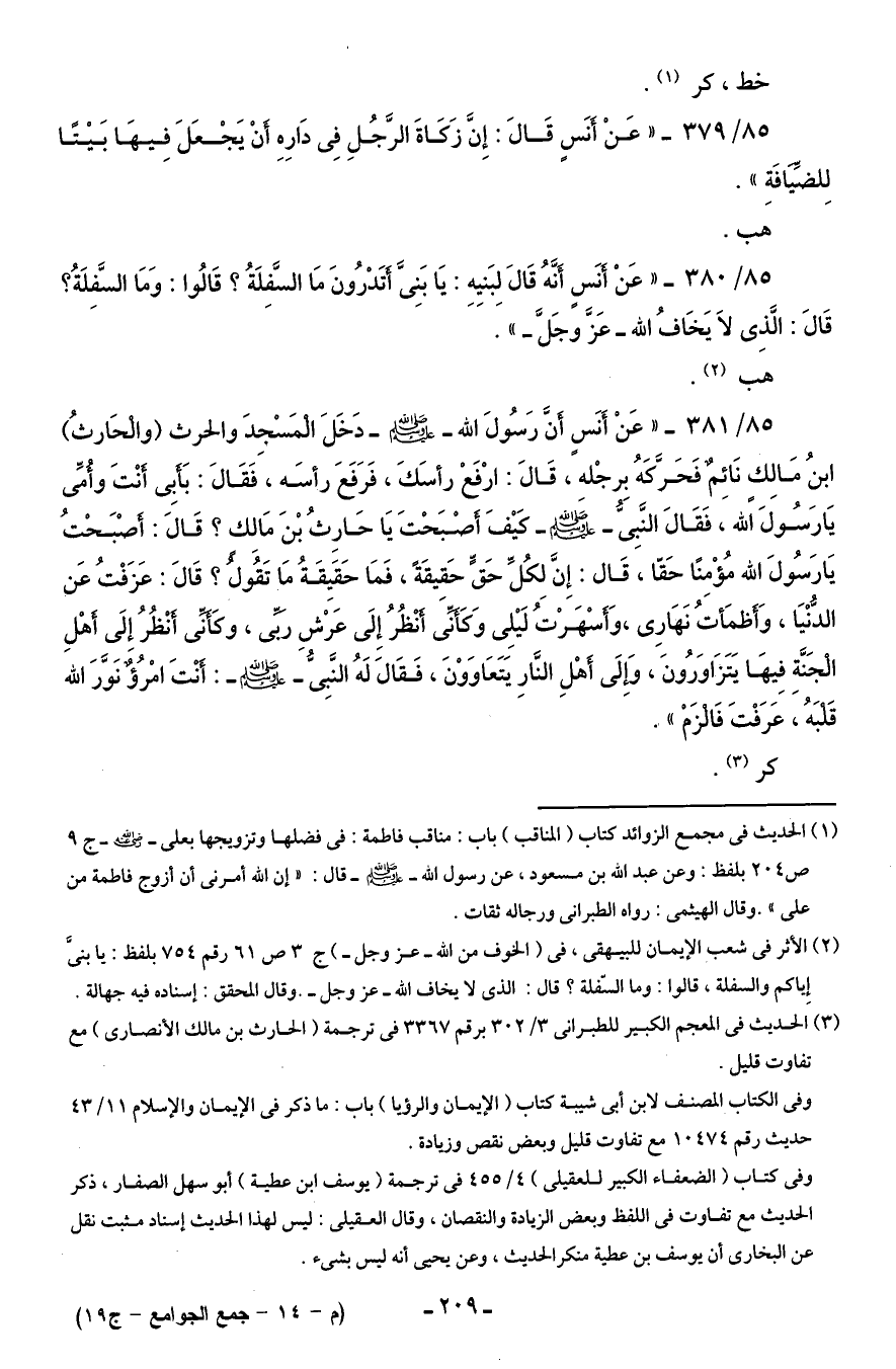 85/ 381 - "عَنْ أَنَس أن رَسُولَ الله - صلى الله عليه وسلم - دَخَلَ المَسْجِدَ والحرث (والحَارثُ) ابنُ مَالك نَائِم فَحَرَّكهُ بِرجْله، قَالَ: ارْفَعْ رأسَكَ، فَرَفَعَ رأسَه، فَقَالَ: بَأبِى أنْتَ وأمِّى يَا رَسُوَلَ الله، فَقَالَ النَّبِىُّ - صلى الله عليه وسلم - كيْفَ أصْبَحْتَ يَا حَارِثُ بْنَ مَالِكٌ؟ قَالَ: أصْبَحْتُ يَا رَسُولَ الله مُؤْمِنًا حَقّا، قَال: إِنَّ لِكُلِّ حَقٍّ حَقِيقَةً، فَمَا حَقَيِقَةُ مَا تَقُول؟ قَالَ: عَزَفْتُ عَن الدُّنْيَا، وَأظمَأتُ نَهَارِى، وَأسْهَرْتُ لَيْلِى وَكَأنِّى أنْظُرُ إِلَى عَرْشِ ربِّى، وكَأنِّى أنْظُرُ إلَى أهْلِ الجَنَّة فِيهَا يَتَزَاوَرُونَ، وَإلَى أهْلِ النَّارِ يَتَعَاوَوْنَ، فَقَالَ لَهُ النَّبِىُّ - صلى الله عليه وسلم -: أنْتَ امْرُؤٌ نَوَّرَ الله قَلبَهُ، عَرَفْتَ فَالزَمْ".