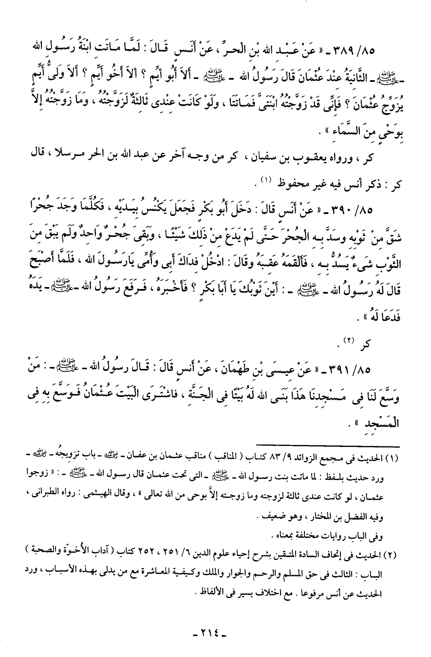 85/ 389 - "عَنْ عَبْدِ الله بْنِ الحرِّ، عَنْ أنَسٍ قَالَ: لَمَّا مَاتَت ابْنَةُ رَسُولِ الله - صلى الله عليه وسلم - الثَّمانِيَةُ عِنْدَ عثمَانَ قَالَ رَسُولُ الله - صَلَّى الله عليه وسلم - ألاَ أَبو أيِّمٍ؟ ألاَ أخُو أيِّمٍ؟ أَلاَ وَلىُّ أيِّمٍ يُزَوِّجُ عثمَانَ؟ فَإِنِّى قَدْ زَوَّجْتُهُ ابْنَتَىَّ فَمَاتَتَا، وَلَوْ كَانَتْ عِنْدِى ثَالِثَة لَزَوَّجْتُهُ، وَمَا زَوَّجْتُهُ إِلَّا بِوَحْى مِنَ السَّمَاءِ".