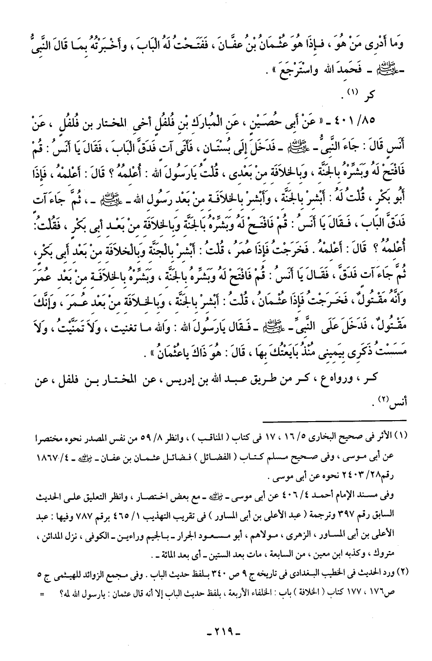 85/ 401 - "عَنْ أَبِى حُصَيْن، عَنِ المُبارَكِ بْنِ فُلفُلٍ أخي المختار بن فُلفُلٍ، عَنْ أنَسٍ قَالَ: جَاءَ النَّبِىُّ - صلى الله عليه وسلم - فَدَخَلَ إِلَى بُسْتَان، فَأتى آت فَدَقَّ البَابَ، فَقَالَ يَا أنَسُ: قُمْ فَافْتَحْ لَهُ وَبَشِّرْهُ بِالجَنَّةِ، وَبِالخلاَفَةِ مِنْ بَعْدِى، قُلت يَا رَسُولَ الله: أعْلِمُهُ؟ قَالَ: أعْلِمْهُ، فَإِذَا أَبُو بَكْرٍ، قُلتُ لَهُ: أبْشِرْ بِالجَنَّةِ، وَأَبْشِرْ بِالخِلاَفَةِ مِنْ بَعْدِ رَسُولِ الله - صلى الله عليه وسلم -، ثُمَّ جَاءَ آت فَدَقَّ البَابَ، فَقَالَ يَا أنَسُ: قُمْ فَافْتَحْ لَهُ وَبَشِّرْهُ بَالجَنَّةِ وَبِالخلاَفَةِ مِنْ بَعْدِ أبِى بَكْر، فَقُلتُ: أعْلِمُهُ؟ قَالَ: أَعْلِمْهُ. فَخَرَجْتُ فَإِذَا عُمَرُ، قُلتُ: أبشِرْ بالجَنَّةِ وَبالخلاَفَةِ مِنْ بَعْدِ أَبِى بَكْر، ثُمَّ جَاءَ آت فَدَقَّ، فَقَالَ يَا أنَسُ: قُمْ فَافْتَحْ لَهُ وَبَشِّرهُ بِالجَنَّةِ، وَبَشِّرْهُ بِالخِلاَفَةِ مِنْ بَعْدِ عُمَرَ وَأنَّهُ مَقْتُولٌ، فَخَرَجْتُ فَإذَا عثمَانُ، قُلتُ: أبشر بِالجَنَّةِ، وَبِالخِلاَفَةِ مِنْ بَعْدِ عُمَرَ، وَإنَكَ مَقْتُول، فَدَخَلَ عَلَى النَّبِىِّ - صلى الله عليه وسلم - فَقَال يَا رَسُولَ الله: وَالله ما تغنيت، وَلاَ تَمَنَّيْتُ، وَلاَ مَسَسْتُ ذَكَرِى بِيَمِينِى منذُ بَايَعْتُكَ بِهَا، قَالَ: هُوَ ذَاكَ يا عثمَانُ".