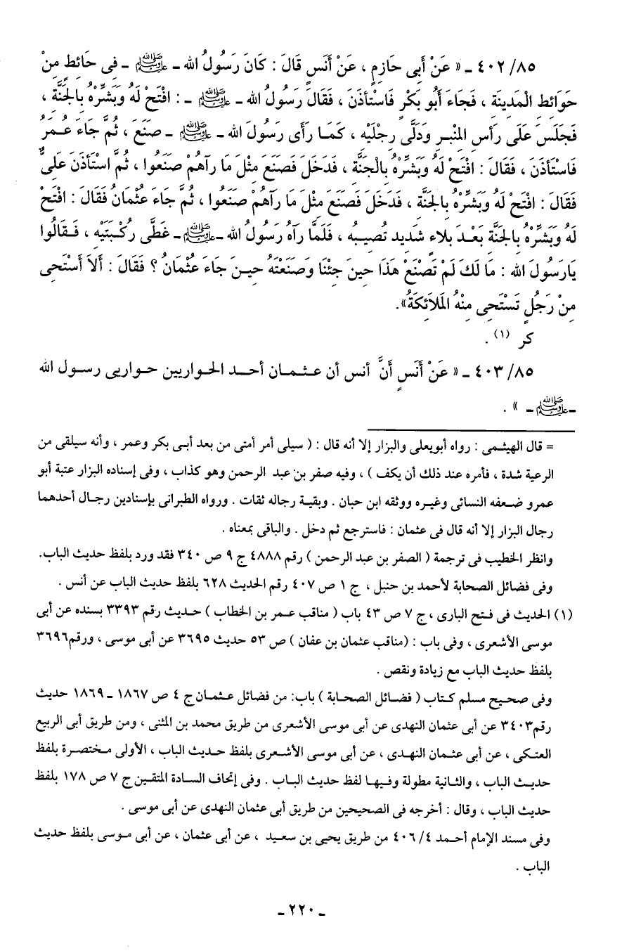 85/ 403 - "عَنْ أنَسٍ أَنَّ أنس أن عثمان أحد الحواريين حواريى رسول الله - صلى الله عليه وسلم -.