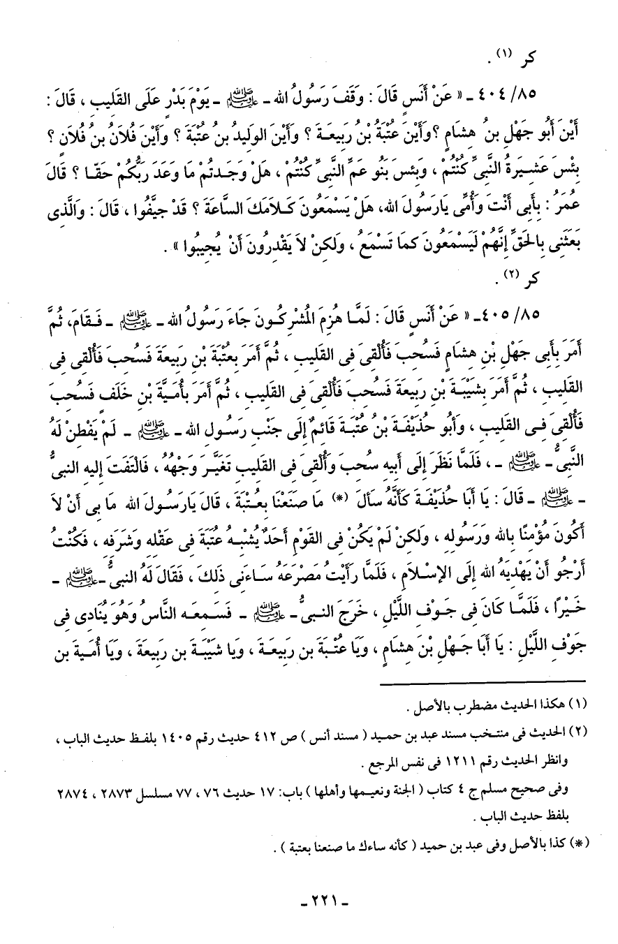 85/ 405 - "عَنْ أنَسٍ قَالَ: لَمَّا هُزِمَ المُشْرِكُونَ جَاءَ رَسُولُ الله - صلى الله عليه وسلم - فَقَامَ، ثُمَّ أمَرَ بِأبِى جَهْلِ بْنِ هِشَامٍ فَسُحِبَ فَألقىَ فِى القَليبِ، ثُمَّ أَمَرَ بِعتبَةَ بْنِ رَبيعَةَ فَسُحِبَ فَألقى فِى القَليبِ، ثُمَّ أَمَرَ بِشَيْبَةَ بْنِ رَبِيعَةَ فَسُحِبَ فَألقِىَ فِى القَلِيبِ، ثُمَّ أَمَرَ بأميةَ بْنِ خَلَف فَسُحِبَ فَألقىَ فِى القَلِيبِ، وَأبُو حُذَيْفَةَ بْنُ عتبَةَ قَائم إلَى جَنْبِ رَسُولِ الله - صلى الله عليه وسلم - لَم يَفْطِنْ لَهُ النَّبِىُّ - صلى الله عليه وسلم -، فَلَمَّا نَظَرَ إِلَى أبيهِ سُحِبَ وَألقِىَ فِى القَلِيبِ تَغَيَّرَ وَجْهُهُ، فَالتفَتَ إِليهِ النبيُّ - صلى الله عليه وسلم - قَالَ: يَا أَبَا حُذَيْفَةَ كَأنَّهُ سَألَ (*) مَا صَنَعْنَا بعُتْبَةَ، قَالَ يَا رَسُولَ الله مَا بِى أَنْ لاَ أكوُنَ مُؤْمِنًا بِالله وَرَسُولِهِ، وَلكِنْ لَمْ يَكُنْ فِى القَوْم أَحَد يُشْبِهُ عُتَبَةَ فِى عَقْلِهِ وَشَرَفهِ، فَكنتُ أَرْجُو أَنْ يَهْدِيَهُ الله إِلَى الإسْلاَم، فَلَمَّا رَأيْتُ مَصْرَعَهُ سَاءَنِى ذَلِكَ، فَقَالَ لَهُ النبيُّ - صلى الله عليه وسلم - خَيْرًا، فَلَمَّا كَانَ فِى جَوْفِ اللَّيْلِ، خَرجَ النبيُّ - صلى الله عليه وسلم - فَسَمِعَه النَّاسُ وَهُوَ يُنَادِى فِى جَوْفِ اللَّيْلِ: يَا أَبَا جَهْلِ بْنَ هِشَامٍ، وَيَا عتبَةَ بن رَبِيعَةَ، وَيا شَيْبَةَ بن رَبِيعَةَ، وَيَا أمَيةَ بن