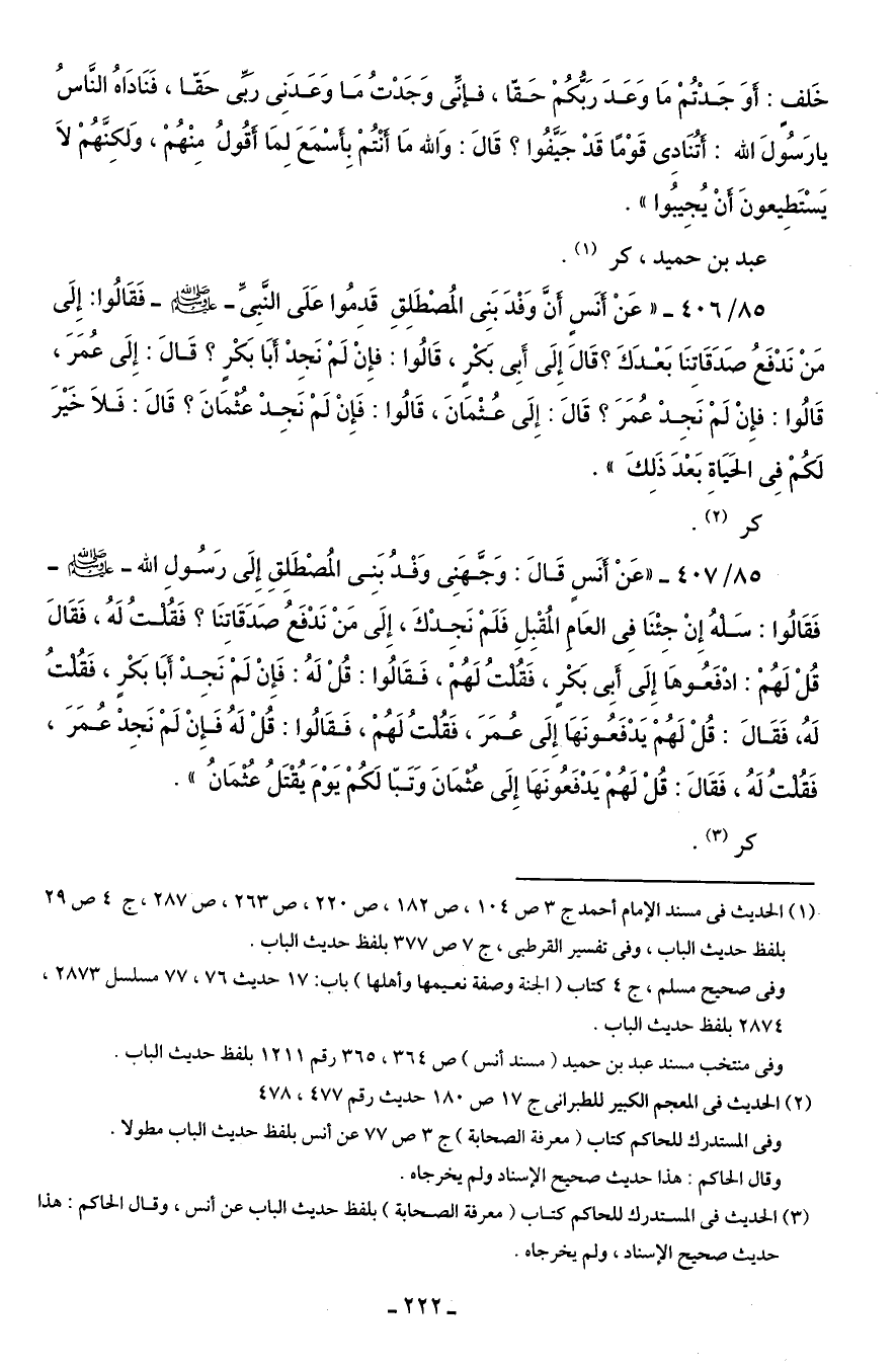 85/ 407 - "عَنْ أنَس قَالَ: وَجَّهَنِى وَفْدُ بَنِى المُصْطَلِقِ إِلَى رَسُولِ الله - صلى الله عليه وسلم - فَقَالُوا: سَلهُ إِنْ جِئْنَا فِى العَام المُقْبِلِ فَلَمْ نَجِدْكَ، إِلَى مَنْ نَدْفَعُ صَدَقَاتِنَا؟ فَقُلتُ لَهُ، فَقَالَ قُلْ لَهُمْ: ادْفَعُوهَا إِلَى أَبِى بَكْر، فَقُلتُ لَهُمْ، فَقَالُوا: قُلْ لَهُ: فَإِنْ لَمْ نَجِدْ أبَا بَكْر، فَقُلتُ لَهُ، فَقَالَ: قُلْ لَهُمْ يَدْفَعُونَهَا إِلَى عُمَرَ، فَقُلتُ لَهُمْ، فَقَالُوا: قُلْ لَهُ فَإِنْ لَمْ نَجِدْ عُمَرَ، فَقُلتُ لَهُ، فَقَالَ: قُلْ لَهُمْ يَدْفَعُونَهَا إِلَى عثمَانَ وَتَبّا لَكُمْ يَوْمَ يُقْتَلُ عثمَانُ".