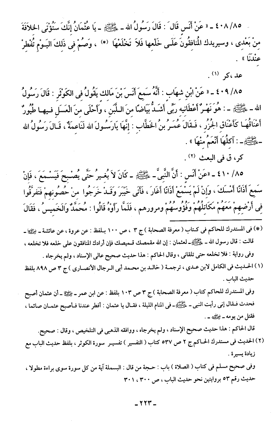 85/ 408 - "عَنْ أَنَسٍ قَالَ: قَالَ رَسُولُ الله - صَلَّى الله عليه وسلم - يَا عثمَانُ إِنَّكَ سَتُؤْتَى الخِلاَفَةَ مِنْ بَعْدِى، وسيريدك المُنافِقُونَ عَلَى خَلعِها فَلاَ تَخْلَعْهَا (*)، وَصُمْ فِى ذَلِكَ اليَوْم تُفْطِرْ عنْدَنَا".