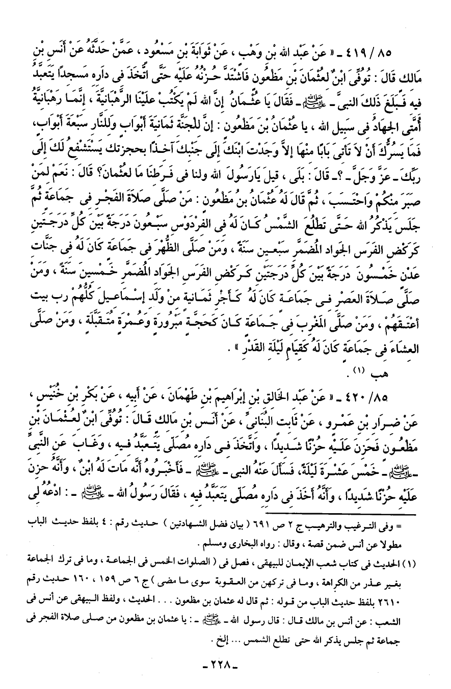 85/ 419 - "عَنْ عَبْدِ الله بْنِ وَهْبٍ، عَنْ ثَوَابَةَ بْنِ مَسْعُود، عَمَّنْ حَدثهُ عَنْ أنسِ بْنِ مَالِكٍ قَالَ: تُوُفِّىَ ابْن لِعثمَانَ بْنِ مَظعُون فَاشْتَدَّ حُزْنهُ عَلَيْه حَتَّى اتخَذَ في داَرِه مَسجِدًا يَتَعبَّدُ فيهِ فبَلَغَ ذَلكَ النبيَّ - صلى الله عليه وسلم - فَقَالَ يَا عثمَانُ إِنَّ الله لَمْ يَكتُبْ علَيْنَا الرَّهبَانيَّةَ، إِنَّمَا رَهْبَانِيَّةُ أُمَّتِى الجهَادُ فِى سَبيل الله، يا عثمَانُ بْنَ مَظعُون: إنَّ لِلجَنَّة ثَمَانيَةَ أبْوَابٍ وَلِلَنَّارِ سَبْعَةَ أبْوَابٍ، فَمَا يَسُرك أنْ لاَ تَأَتِىَ بَابًا منْهَا إلَّا وَجَدْتَ ابْنَكَ إِلَى جَنْبِكَ آخَذًا بحجزتك يَسْتَشْفِعُ لَكَ إِلَىَ ربِّكَ - عَزَّ وَجَلَّ -؟ - قَالَ: بَلَى، قِيلَ يَا رَسُولَ الله ولنا في فَرَطنَا مَا لعثمانَ؟ قَالَ: نَعَمْ لِمَنْ صَبَرَ مِنكمْ وَاحْتَسَبَ، ثمَّ قَالَ لَهُ عثمَانُ بنُ مَظعُون: مَنْ صَلَّىَ صَلاَةَ الفَجْرِ فِى جَمَاعَةٍ ثُمَّ جَلَسَ يَذْكُرُ الله حَتَّى تَطلُعَ الشمس كانَ لَهُ فِى الفِرْدَوْسِ سَبْعُونَ دَرَجَةً بَيْنَ كُلِّ دَرَجَتَينِ كَرَكضِ الفَرَس الجَواد المُضَمَّر سَبْعيِن سَنَةً، وَمَنْ صَلَّى الظُّهْرَ فِى جَمَاعَةٍ كَانَ لَهُ فِى جَنَّاتِ عَدْن خَمْسُونَ دَرَجَةً بَيْنَ كُل دَرَجَتَيْنِ كَرَكْضِ الفَرَسِ الجَوَاد المُضَمَّرِ خَمْسينَ سَنَةً، وَمَنْ صَلَّى صَلاَةَ العَصْر فِى جَمَاعَةٍ كانَ لَهُ كَأجْرِ ثَمَانية مِنْ وَلًدِ إسْمَاعيلَ كلُّهُمْ رب بيت أعْتَقَهُمْ، وَمَنْ صَلَّىَ المَغْرِبَ فِى جَمَاعَةٍ كان كَحَجَّة مَبْرُورَةٍ وَعُمْرَةٍ مُتَقَبَّلَةٍ، وَمَنْ صَلَّى العِشَاءَ فِى جَمَاعَةِ كَانَ لَهُ كَقِيَام لَيْلَةِ القَدْرِ".