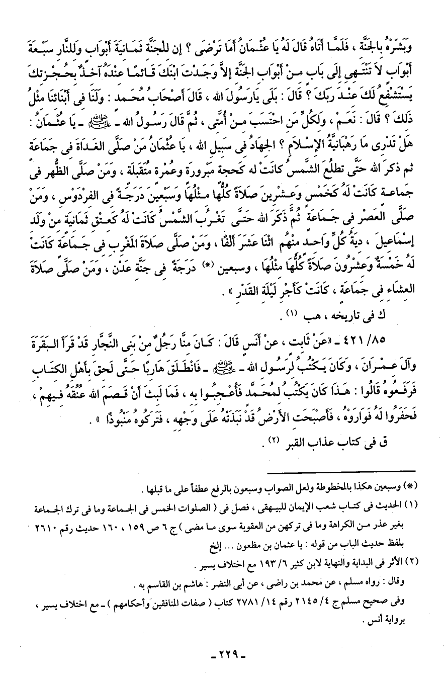 وَبَشِّرْهُ بالجَنَّةِ، فَلَمَّا أتَاهُ قَالَ لَهُ يَا عثمَانُ أمَا تَرْضَى؟ إن للجَنَّة ثَمَانِيَةَ أبْوَاب وَلِلنَّارِ سَبْعَةَ أبوَاب لَاَ تَنْتَهِي إِلَى بَاب مِنْ أبْوَابِ الجَنَّةِ إلَّا وَجَدْتَ ابْنَكً قائمًا عِنْدَهُ آخًذٌ بِحُجْزتِكَ يَسْتَشْفِعُ لَكَ عِنْدَ ربكَ؟ قَالَ: بَلَى يَا رَسُولَ الله، قَالَ أصْحَابُ مُحَمدٍ: وَلَنَا فِى أبنَائنَا مِثْلُ ذَلِكَ؟ قَالَ: نَعَمْ، وَلِكُلِّ مَنِ احْتَسَبَ مِنْ أُمَّتِى، ثمَّ قَالَ رَسُولُ الله - صلى الله عليه وسلم - يَا عثمَانُ: هَلْ تَدْرِى مَا رَهْبَانيَّةُ الإِسْلاَم؟ الجِهَادُ فِى سَبِيلِ الله، يَا عثمَانُ مَنْ صَلَّى الغَدَاةَ فِى جَمَاعَةٍ ثم ذكرَ الله حَتَّى تطلُعَ الشَّمسُ كانَتْ له كَحجة مَبْرورَة وعُمْرةٍ مُتَقَبلَةٍ، وَمَنْ صَلَّى الظُّهر في جَماعة كانَتْ لَهُ كخَمْسٍ وَعشْرِينَ صَلاَةً كلُّها مِثْلُها وَسَبْعِينَ دَرَجَةً فِى الفِرْدَوْسِ، وَمَنْ صَلَّى العَصْر فِى جَمَاعَة ثُمَّ ذَكَرَ الله حَتَّى تَغْرُبَ الشمس كانت لَهُ كَعِتْقِ ثَمَانِيَةٍ مِنْ وَلَدِ إسْمَاعِيلَ، دِيَةُ كُلِّ وَاحد منْهُم اثنا عَشَرَ ألفًا، وَمَنْ صَلَّى صَلاَةَ المَغْرِبِ فِى جَمَاعَة كانت لَهُ خَمْسَةٌ وَعِشْرُونَ صَلاةً كلّهَا مِثْلُهَا، وسبعين (*) دَرَجَةً فِى جَنَّةِ عَدْن، وَمَنْ صَلَّى صَلاَةَ العِشَاءِ فِى جَمَاعَةٍ، كانت كَأجْرِ لَيْلَةِ القَدْرِ".