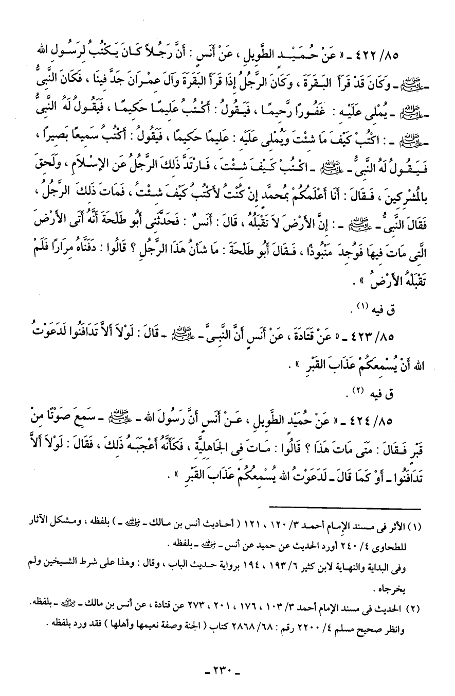 85/ 424 - "عَنْ حُمَيْدٍ الطَّوِيلِ، عَنْ أنسٍ أَنَّ رَسُولَ الله - صلى الله عليه وسلم - سَمِعَ صَوْتًا مِنْ قَبْرٍ فَقَالَ: مَتَى مَاتَ هَذَا؟ قَالُوا: مَاتَ فِى الجَاهِلِيَّةِ، فَكَأنَّهُ أعْجَبَهُ ذَلِكَ، فَقَالَ: لَوْلاَ ألَّا تَدَافَنُوا - أوْ كمَا قَالَ - لَدَعَوْتُ الله يُسْمِعُكُمْ عَذَابَ القَبْرِ".