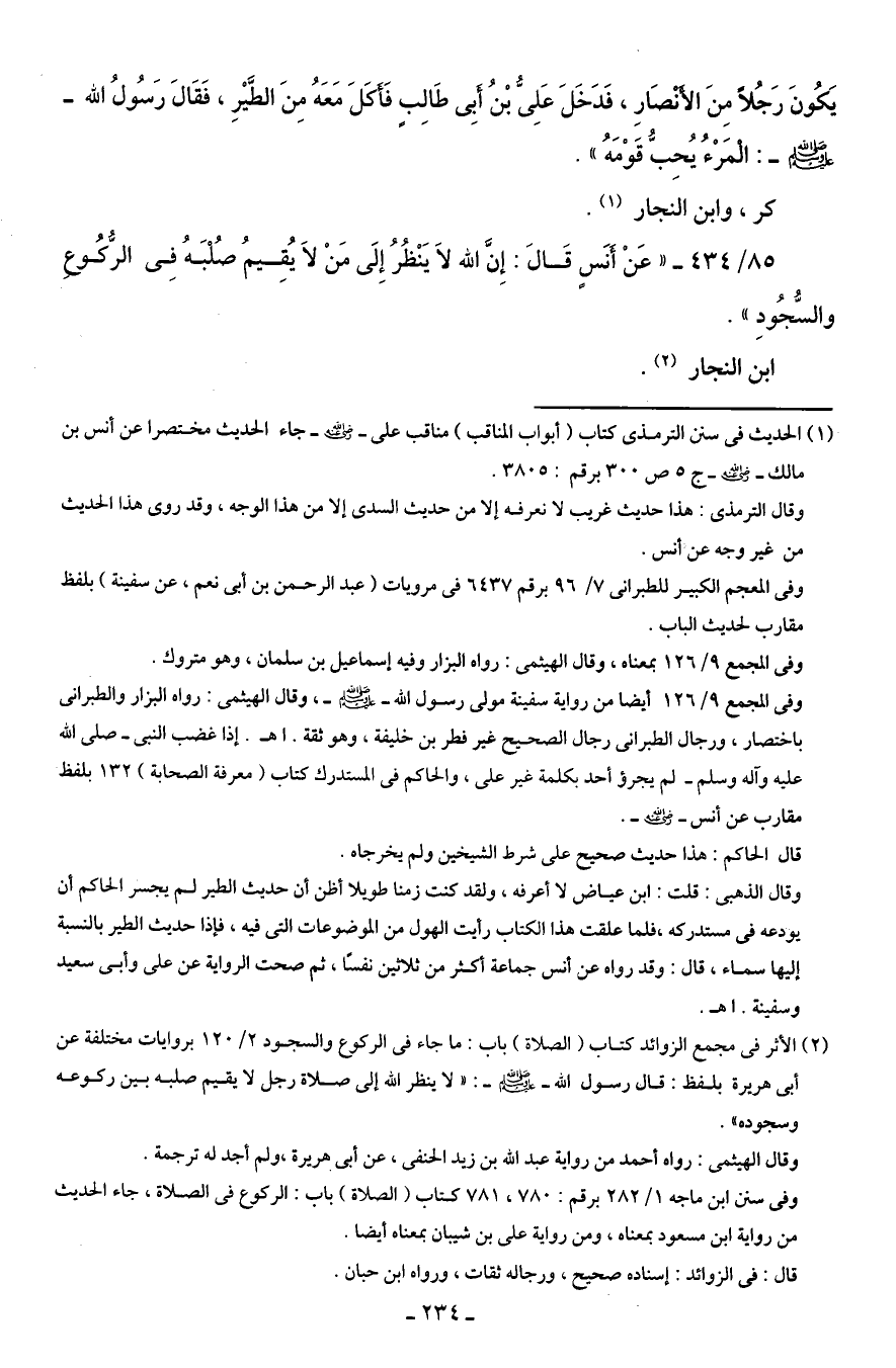 85/ 434 - "عَنْ أنسٍ قَالَ: إِنَّ الله لاَ يَنْظُرُ إِلَى مَنْ لاَ يُقِيمُ صُلبَهُ فِي الرُّكُوع والسُّجُودِ".