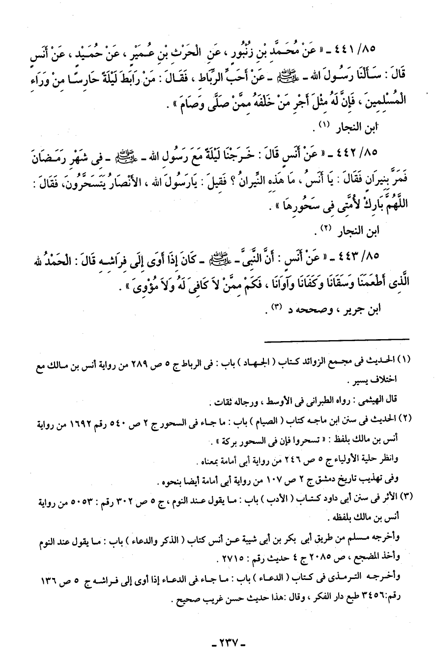 85/ 441 - "عَنْ مُحَمَّدِ بْنِ زنبُورٍ، عَنِ الحَرْثِ بْنِ عُمَيْرٍ، عَنْ حُمَيْدٍ، عَنْ أنسٍ قَالَ: سَألنَا رَسُولَ الله - صلى الله عليه وسلم - عَنْ أحَبِّ الرباطِ، فَقَالَ: مَنْ رَابَطَ لَيْلَة حَارِسًا مِنْ وَرَاءِ المُسْلِمِينَ، فَإِنَّ لَهُ مِثْلَ أجْرِ مَنْ خَلفَهُ مِمَّنْ صَلَّى وَصَامَ".