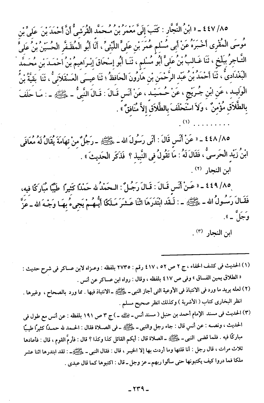 85/ 447 - "ابْنُ النَّجَّارِ: كَتَبَ إِلَىَّ مَعْمَرُ بْنُ مُحَمَّدٍ القُرَشِىُّ أنَّ أحْمَدَ بْنَ عَلِىِّ بْنِ مُوسَى المُقْرِى أخْبَرَهُ عَنْ أبِى مُسْلِمٍ عُمَرَ بْنِ عَلِىٍّ اللِّيثِىِّ، أَنَا أَبُو المُظَفَّرِ الحُسَيْنُ بْنُ عَلِىٍّ التَّاجِرُ بِبَلخٍ، ثَنَا غَالِبُ بْنُ عَلِىٍّ أَبُو مُسْلِمٍ، ثَنَا أَبُو إِسْحَاقَ إِبْرَاهِيمُ بْنُ أحْمَدَ بْنِ مُحَمَّدٍ البَغْدَادِىُّ، ثَنَا أَحْمَدُ بْنُ عَبْدِ الرَّحْمَنِ بْنِ هَارُونَ الحَافِظُ؛ ثَنَا عِيسَى العَسْقَلاَنِيُّ، ثَنَا بَقِيَّةُ بْنُ الوَلِيدِ، عَنِ ابْنِ جُرَيْجٍ، عَنْ حُمَيْدٍ، عَنْ أَنَسٍ قَالَ: قَالَ النَّبِيُّ - صلى الله عليه وسلم -: مَا حَلَفَ بِالطَّلاَقِ مُؤْمِنٌ، وَلاَ اسْتَحْلَفَ بِالطَّلاَقِ إلَّا مُنَافِقٌ".