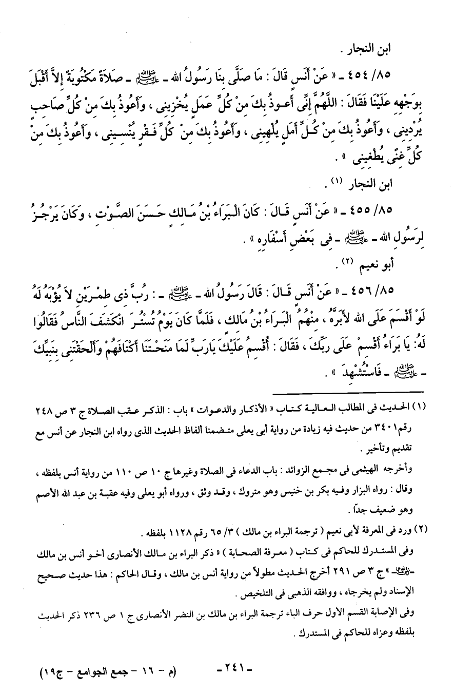 85/ 455 - "عَنْ أنسٍ قَالَ: كَانَ البَرَاءُ بْنُ مَالِكٍ حَسَنَ الصَّوْتِ، وَكَانَ يَرْجُزُ لِرَسُولِ الله - صلى الله عليه وسلم - فِى بَعْضِ أسْفَارِهِ".