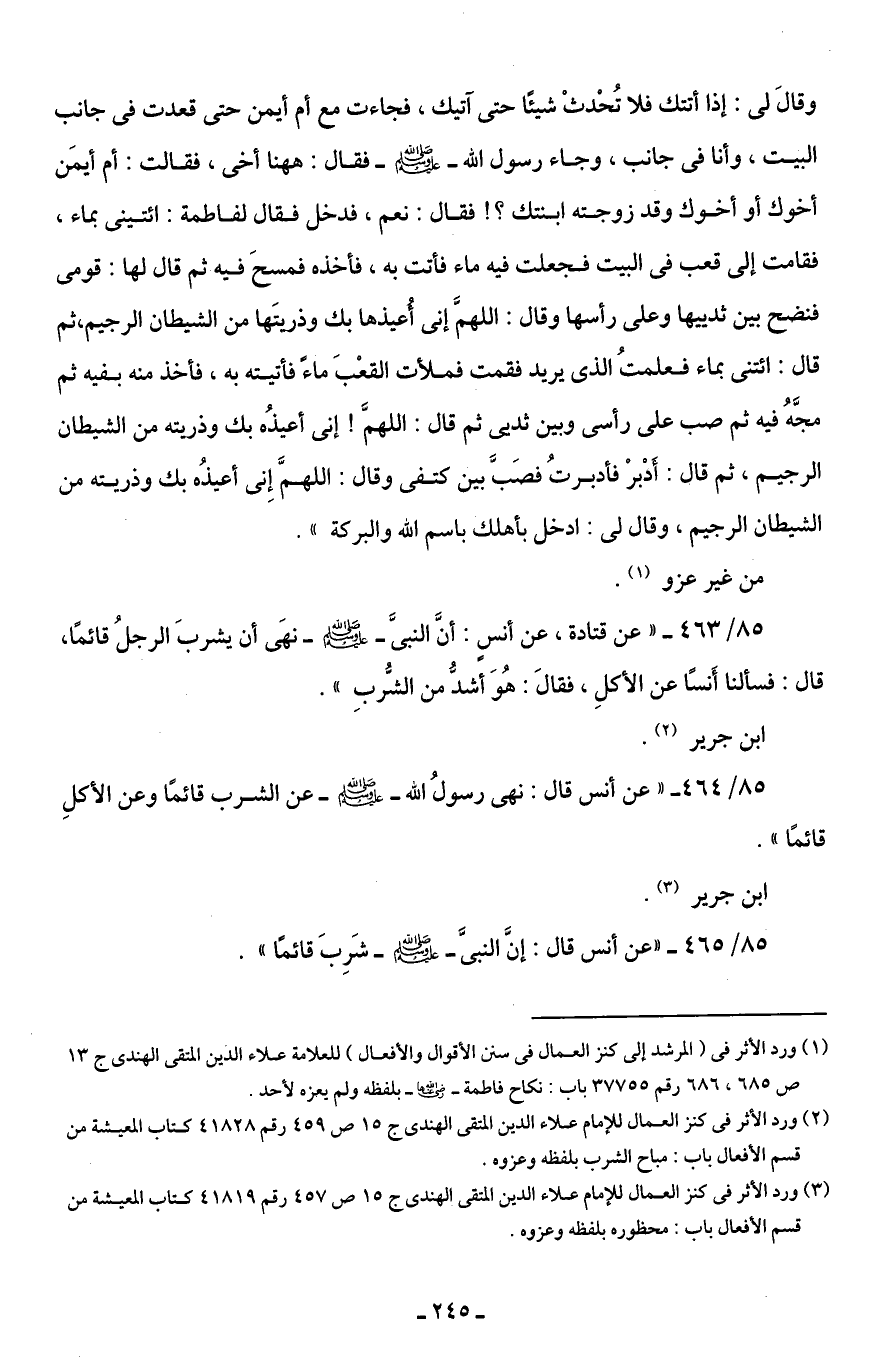 85/ 465 - "عن أنس قال: إن النبي - صلى الله عليه وسلم - شَرِبَ قائمًا".