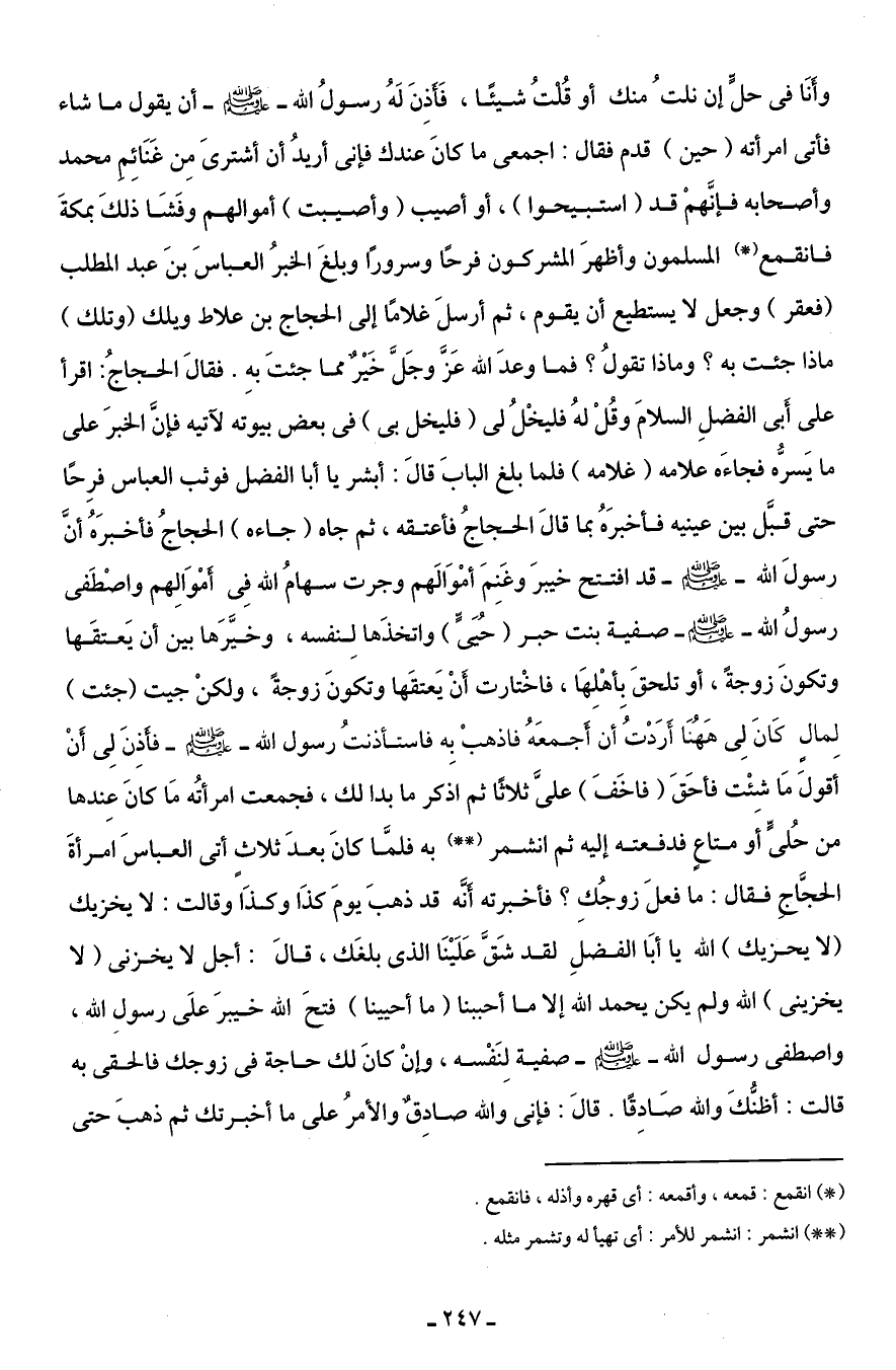 وأنَا في حلٍّ إن نلتُ منك أو قُلتُ شيئًا، فَأذِنَ لَهُ رسولُ الله - صلى الله عليه وسلم - أن يقول ما شاء فأتى امرأته (حين) قدم فقال: اجمعى ما كانَ عندك فإنى أريدُ أن أشترىَ مِن غَنَائِم محمد وأصحابه فإنَّهمْ قد (استبيحوا)، أو أصيب (وأصيبت) أموالهم وفَشَا ذلكَ بمكةَ فانقمع (*) المسلمون وأظهرَ المشركون فرحًا وسرورًا وبلغَ الخبرُ العباسَ بنَ عبد المطلب (فعقر) وجعل لا يستطيع أن يقوم، ثم أرسلَ غلامًا إلى الحجاج بن علاط ويلك (وتلك) ماذا جئت به؟ وماذا تقولُ؟ فما وعدَ الله عَزَّ وجَلَّ خَيْرٌ مما جئتَ بهِ. فقالَ الحجاجُ: اقرأ على أَبي الفضلِ السلامَ وقُلْ لهُ فليخْلُ لى (فليخل بى) في بعض بيوته لآتيه فإنَّ الخبرَ على ما يَسرُّه فجاءَه علامه (غلامه) فلما بلغ البابَ قالَ: أبشر يا أبا الفضل فوثب العباس فرِحًا حتى قبَّل بين عينيه فأخبرَهُ بما قالَ الحجاجُ فأعتقه، ثم جاه (جاءه) الحجاجُ فأخبرَهُ أنَّ رسولَ الله - صلى الله عليه وسلم - قد افتتح خيبرَ وغَنِمَ أمْوَالَهم وجرت سهامُ الله فِى أمْوَالِهم واصْطَفى رسولُ الله - صلى الله عليه وسلم - صفية بنت حبر (حُيىٍّ) واتخذَها لِنفسه، وخيَّرَها بين أن يَعتقَها وتكونَ زوجةً، أو تلحقَ بِأهْلِهَا، فاخْتارت أَنْ يَعتقَها وتكونَ زوجةً، ولكنْ جيت (جئت) لِمالٍ كَانَ لِى هَاهُنَا أَرَدْتُ أن أَجمعَهُ فاذهبْ بِه فاستأذنتُ رسول الله - صلى الله عليه وسلم - فأذِنَ لِى أنْ أقولَ مَا شِئْت فأحَقَ (فاخَفَ) عليَّ ثلاثًا ثم اذكر ما بدا لك، فجمعت امرأتُه مَا كانَ عِندها من حُليٍّ أو متاعٍ فدفعته إليه ثم انشمر (* *) به فلمَّا كانَ بعدَ ثلاثٍ أتى العباسَ امرأةَ الحجَّاج فقال: ما فعلَ زوجُكِ؟ فأخبرته أنَّه قد ذهبَ يوم كذَا وكذَا وقالت: لا يخزيك (لا يحزيك) الله يا أبَا الفضلِ لقد شَقَّ عَلَيْنَا الذى بلغَك، قالَ: أجل لا يخزنى (لا يخزينى) الله ولم يكن يحمد الله إلا ما أحببنا (ما أحيينا) فتحَ الله خيبرَ علَى رسولِ الله، واصطفى رسول الله - صلى الله عليه وسلم - صفية لِنَفْسه، وإنْ كانَ لك حاجة في زوجك فالحقى به قالت: أظنُّكَ والله صَادِقًا. قالَ: فإني والله صادِقٌ والأمرُ على ما أخبرتك ثم ذهبَ حتى