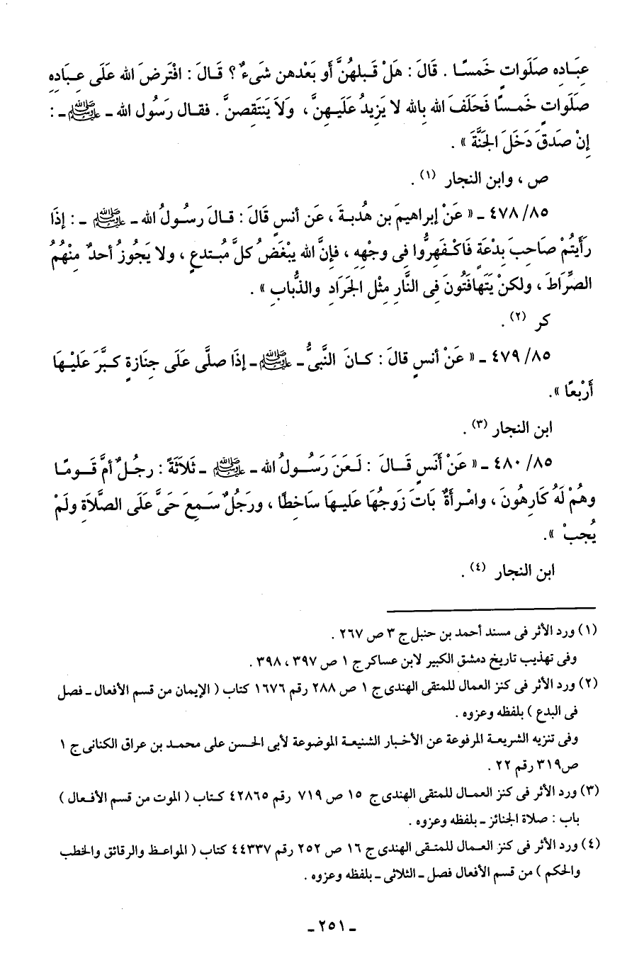 85/ 479 - "عَنْ أنسٍ قالَ: كانَ النَّبيّ - صلى الله عليه وسلم - إذَا صلَّى عَلَى جنَازة كبَّرَ عَليْهَا أرْبعًا".